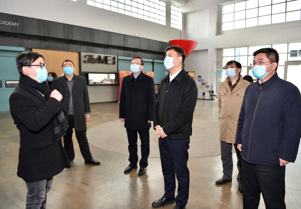 谢坚钢、薛侃一行首先来到我校四平路校区正门,检查我校校门管控情况,参观体验了由我校自主研发的已在校门口试运行近一个月的疫情防控智能识别系统。他们先后来到学校校史馆、干训楼集中隔离点、设计创意学院等处,分别参观、了解我校110余年办学历程、疫情防控隔离措施,以及设计创意学院发挥学科优势,与周边社区联动发展的一系列创新实践。在建筑设计研究院,谢坚钢、薛侃一行了解建筑设计研究院复工情况,参观了环同济知识经济圈及大学科技园建设展览。