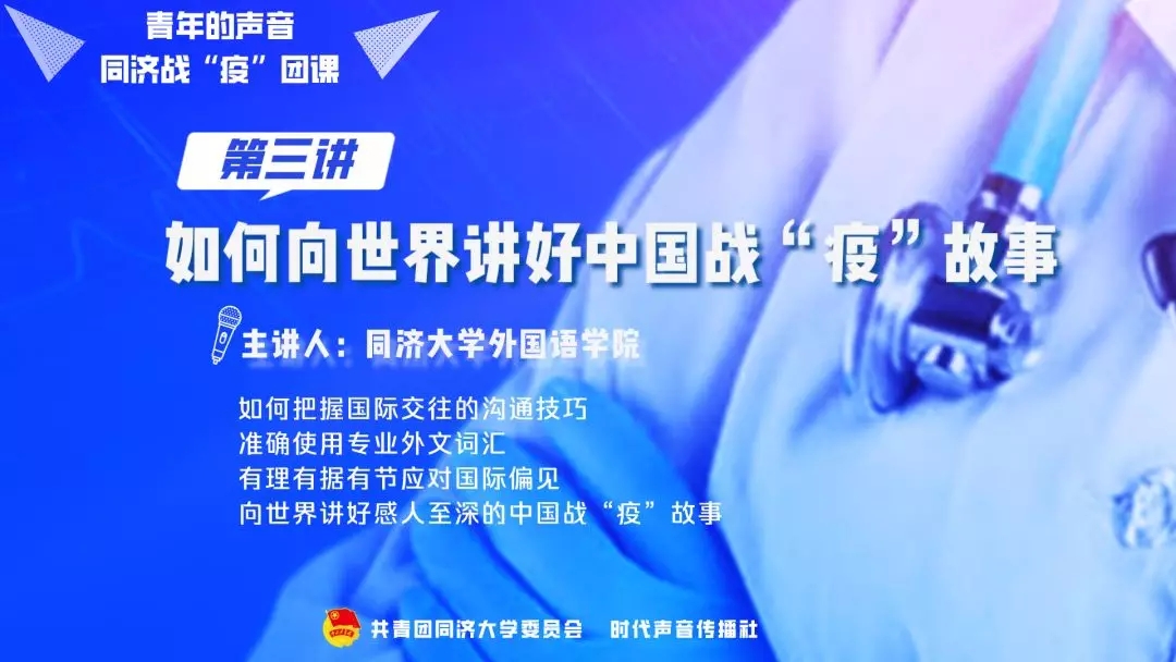 同济青年如何向世界讲好中国的战“疫”故事?同济战“疫”系列线上团课第三讲于3月20日15:00在哔哩哔哩直播间举行。本次团课由校团委联合时代声音传播社、外国语学院共同举办,邀请到外国语学院黄立鹤、郭靓靓、时晓阳、钱玲燕四位老师分别从不同方面分享如何向世界讲好中国的战“疫”故事。我校全体团干部、团支书、广大团员青年共计6600余人在线共同观看直播,以期让同济青年在国际交流中做到把握国际交往的沟通技巧、准确使用专业外文词汇、有理有据有节应对国际偏见、向世界讲好感人至深的中国战“疫”故事。