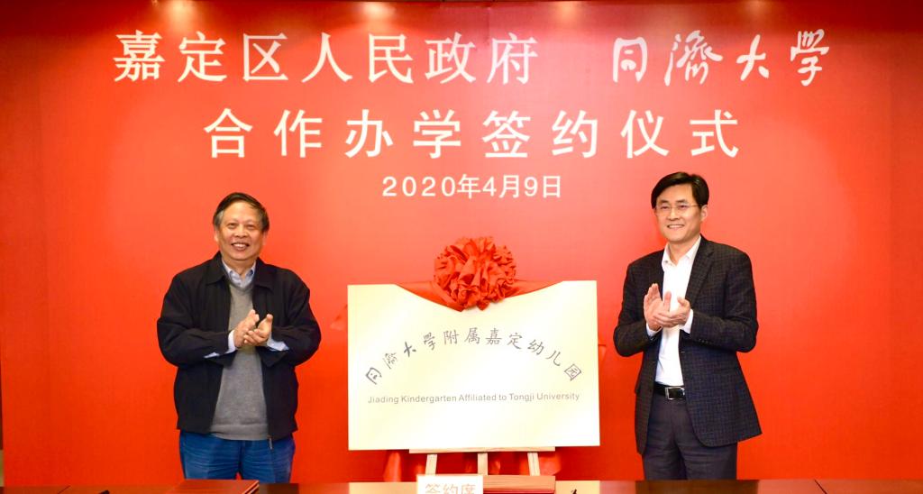4月9日,同济大学与嘉定区人民政府共同签署《合作共建幼儿园协议书》。区校联手共建同济大学附属嘉定幼儿园,进一步深化“同济-嘉定”合作办学模式,发挥同济大学各类资源优势,共同促进嘉定区学前教育稳步发展,完善同济大学基础教育(含学前教育)建设,首轮签约期限为5年。我校常务副校长伍江,嘉定区副区长王浩,嘉定区教育局局长姚伟、副局长赵丽鸾,安亭镇镇长项平、副镇长叶蓉,国际汽车城(集团)公司董事长陈钢等出席签约仪式。王浩、伍江分别致辞,代表双方签约,并为同济大学附属嘉定幼儿园揭牌。