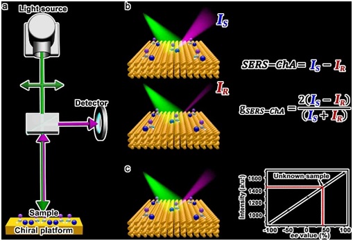 SERS-ChA是手性等离子体金属表面对对映体分子的拉曼散射选择性增强性质,具有很高的对映体敏感性,克服了旋光系统和色谱法的缺点。此方法具有普适性,无需分离样品,无需提纯样品,不管分子大小,有无极性以及是否具有发色团,仅用一种基底,可以定性定量检测除内消旋体外的所有手性分子。