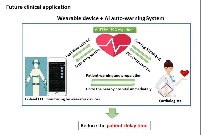 为了进一步研究其临床适用性,团队还进一步开展了人机心电图判读比赛,将50张急性ST段抬高型心肌梗死心电图及50张非急性ST段抬高型心肌梗死心电图分别由本算法及15位不同年资的心血管医生进行判读。结果显示,本算法的敏感性及特异性分别为90%及98%,而医生判读的敏感性及特异性仅71%及89%。尤其是在一些ST段抬高相对不明显的患者中,人工智能算法的优势更加明显。这一结果对急性ST段抬高型心肌梗死的自动预警提供了重要的软件支持,未来将该算法嵌入可穿戴心电监测设备是急性心肌梗死院前预警非常有前途的方案。