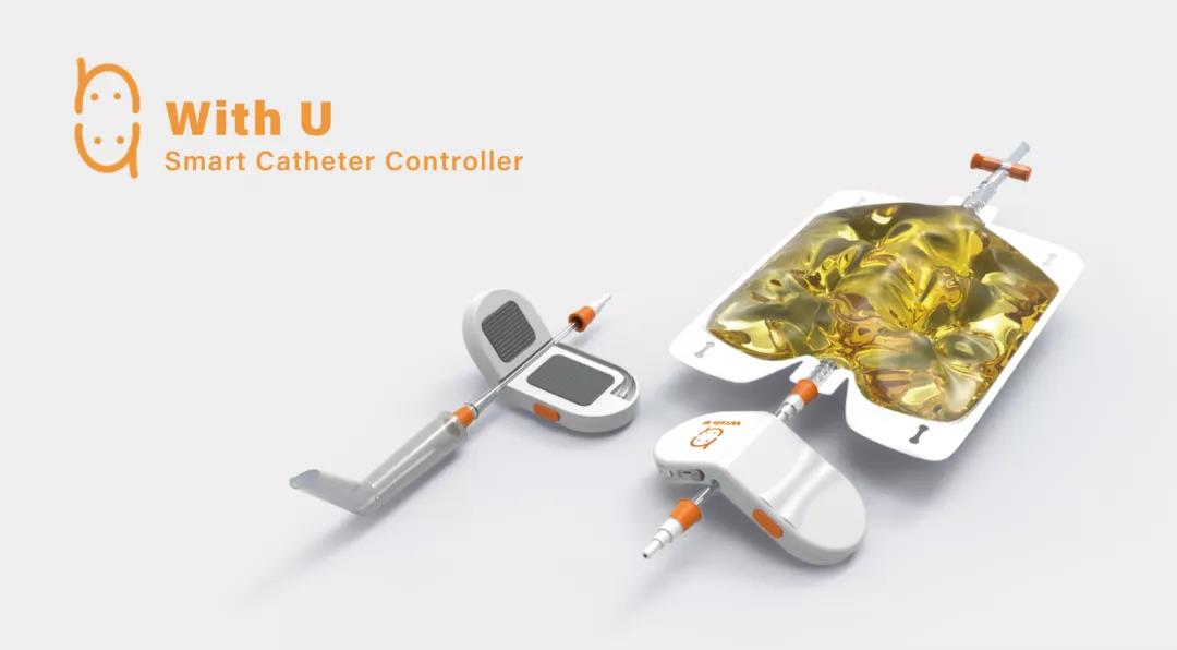 作为从留置导尿管转为间歇导尿管的过渡产品,With U旨在方便神经源性膀胱患者的日常生活,防止长期留置导尿后膀胱发生废用性萎缩,并提供后续康复可能。With U用户会经历两个康复阶段。产品系统包括智能控制器、再设计的引流袋、引流管、绑带和手机app。控制器上端连接留置导尿管,下端连接引流袋或引流管,用户可使用绑带将所有部件固定在腿上。通常,控制器的阀门关闭,尿液积存在膀胱中。控制器内部的传感器实时监测膀胱内压强,计算膀胱容量并发送到app上。康复第一阶段,用户使用引流袋收集尿液。当膀胱一定容量被占用时,控制器的阀门打开,将尿液排出,保证患者膀胱肌肉因储存尿液得到锻炼,避免废用性萎缩。第二阶段,监测到膀胱较满时,控制器会震动提醒用户去洗手间排尿。用户可同时按动控制器两侧的排尿键,通过引流管直接将尿液排出。控制器表面有一道凹槽,方便用户隔着衣料找到排尿按键。用户可在app上查询当前的膀胱容量以及康复进程。
