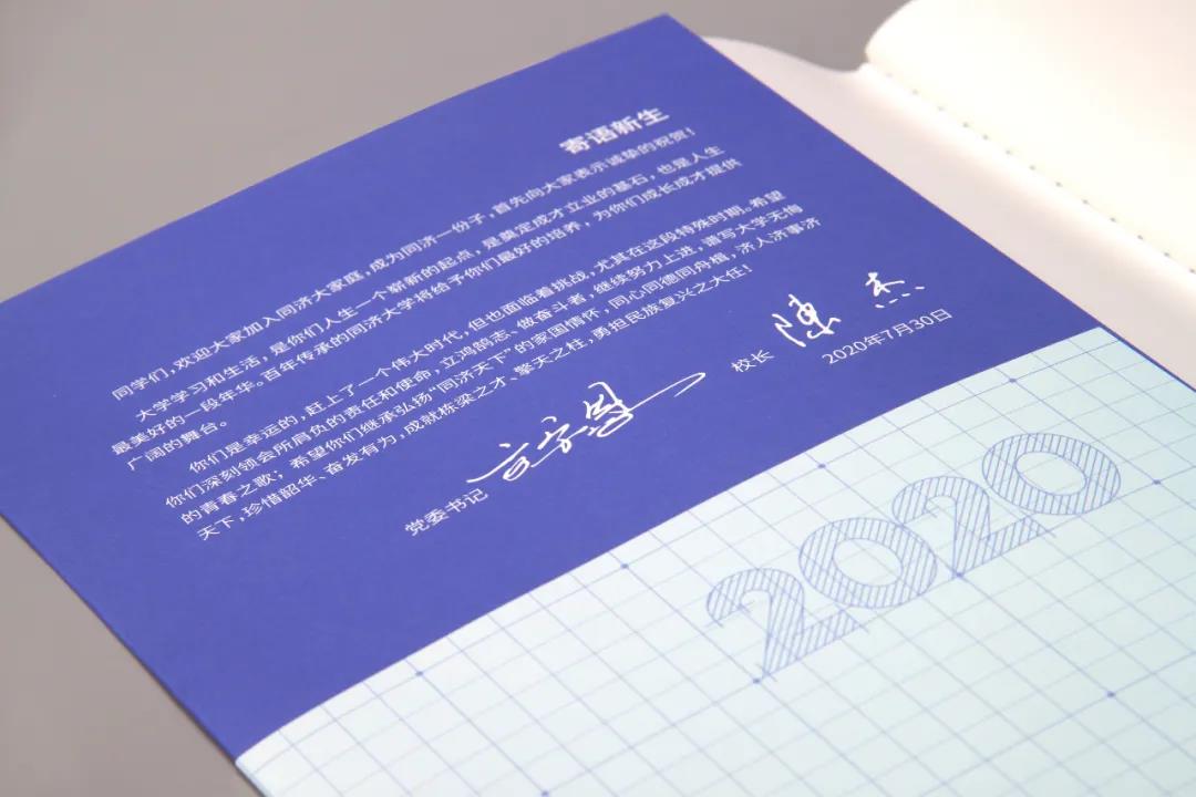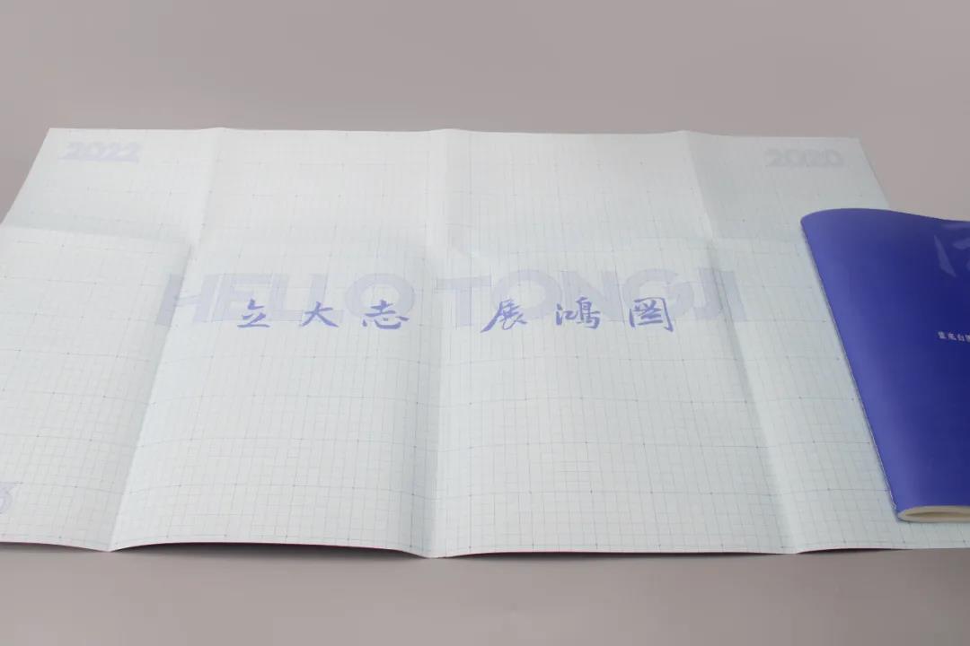 今年的通知书里还有一份神秘礼物,是一张图纸,取意“大展鸿图”,一张展示学子大学四年的“Master Plan”。同学们可在这张图纸上书写最精彩的同济青春。四年制的专业在校时间不过200周,学校还为每位新同学寄送了一本从第200周开始的“时光计”本。在“时光计”本的首页,有同济大学党委书记方守恩和校长陈杰为新生送出的寄语,希望每位同济新学子“立鸿鹄志,做奋斗者,珍惜韶华,奋发有为”!