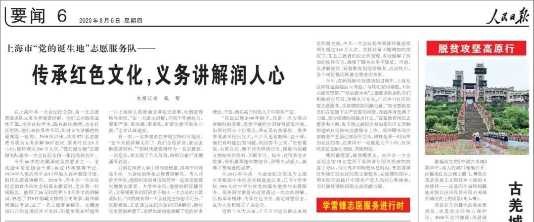 上述这段文字,摘自8月6日《人民日报》一篇题为《上海市“党的诞生地”志愿服务队——传承红色文化,义务讲解润人心》的报道中。