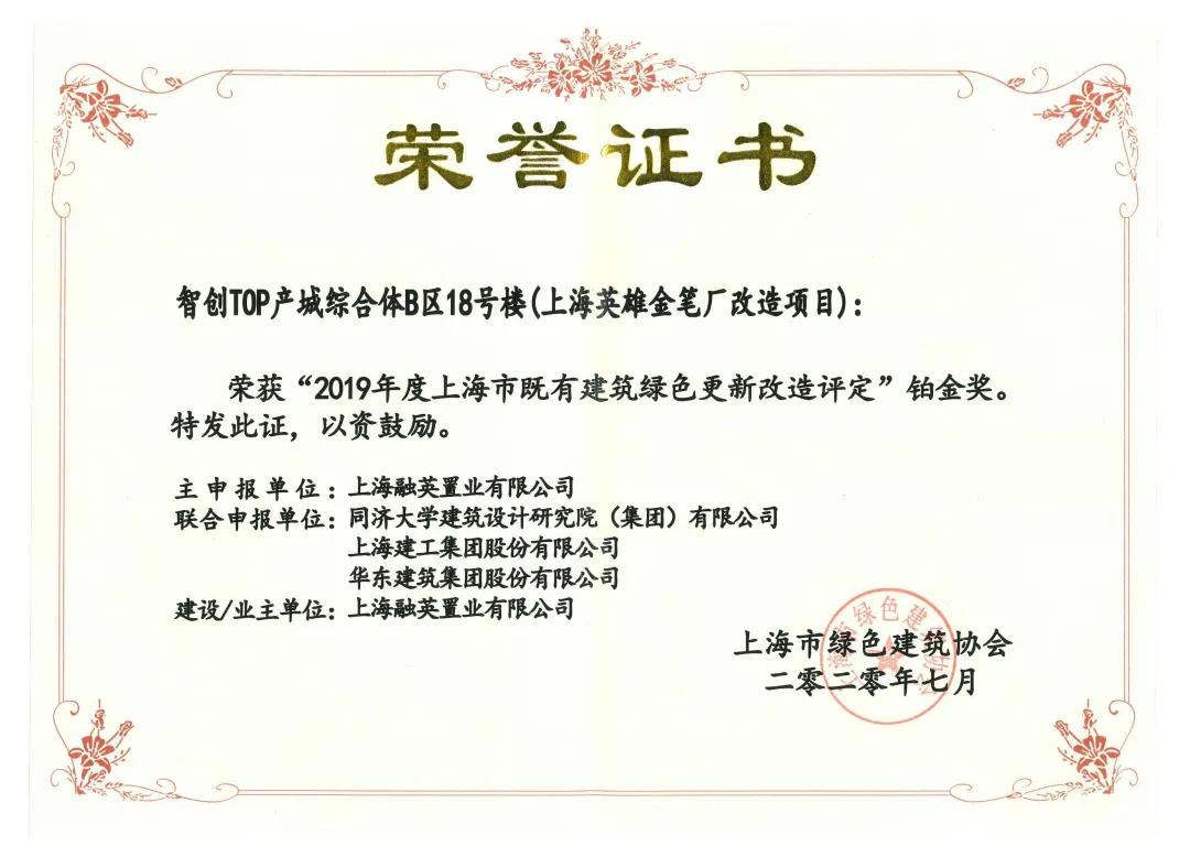 获铂金奖的2项目分别为光明田原游客接待中心 、智创TOP产城综合体B区18号楼(上海英雄金笔厂改造项目)。光明田原游客接待中心位于崇明岛北侧,原为一座铸铁加工厂,光明食品集团上海置地有限公司基于项目周边生态农业产业项目“光明田原”的规划,通过既有建筑绿色更新技术对废弃工厂进行修缮,为游客提供旅游服务。项目实施了既有建筑改造的技术策划及全过程把控。