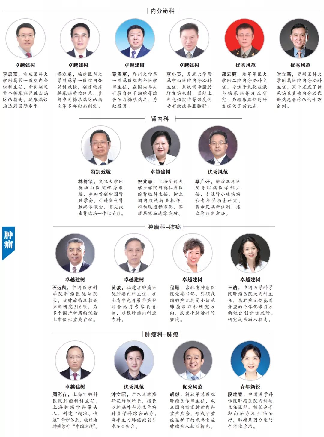 周彩存为附属上海市肺科医院肿瘤科主任、上海肺癌学科带头人,创建“精准、快速”诊断体系,被评为肺癌诊疗“中国速度”。梁爱斌为附属同济医院副院长,在国内率先开展CART细胞治疗血液肿瘤,率先建立完整的附红细胞体病诊疗体系。刘学波为附属同济医院心内科主任,提出弥漫性支架扩张不良的支架失败机制,指导完成复杂冠脉手术近万例。陈昶为附属上海市肺科医院副院长、肺移植中心主任,致力于改进肺移植术和术后管理细节,使移植围术期成功率达95%以上。