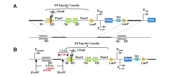 研究团队将基于绿色荧光蛋白 GFP 建立的检测HR的报告载体整合到小鼠基因组Rosa26位点(图1),建立了体内检测HR效率的报告小鼠模型,同时结合Gorbunova教授课题组赠予的NHEJ报告小鼠模型,通过尾静脉注射将外源 I-SceI质粒导入小鼠肝脏,从而诱导报告载体发生定点的DSB。若细胞成功通过 HR 或者NHEJ 修复该损伤,细胞会发出绿色荧光,因此可以定量分析组织中HR 或 NHEJ 修复的频率。在 DEN/CCl4/乙醇诱导的小鼠肝细胞癌模型中检测发现,相比于癌旁组织,HR 和 NHEJ 在癌组织中分别提升了1.6和2.5倍。