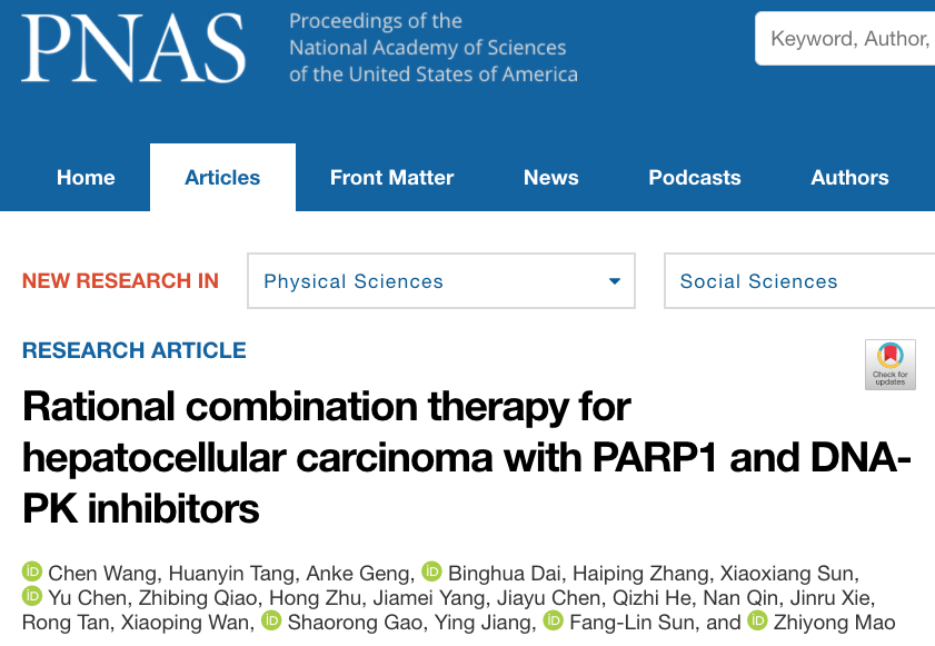 10月5日,同济大学附属第一妇婴保健院、生命科学与技术学院毛志勇教授团队与同济大学生命科学与技术学院、附属东方医院孙方霖教授团队联合在PNAS(《美国科学院院报》)上在线发表了题为“Rational combination therapy for hepatocellular carcinoma with PARP1 and DNA-PK inhibitors”的研究工作。该研究首次利用小鼠报告模型在体内比较了肝细胞癌和癌旁组织的DSB修复能力,发现肝细胞癌中同源重组(Homologous recombination, HR) 和非同源末端连接(Nonhomologous end joining, NHEJ)修复效率均显著上调,而PARP1 和 DNA-PKcs是介导该变化的关键基因。进一步的研究提示,同时靶向抑制 PARP1 和 DNA-PKcs 酶活显著抑制了小鼠原位肝细胞癌和人肝细胞癌的PDX模型的增殖,提示其具有重要的潜在临床应用价值。