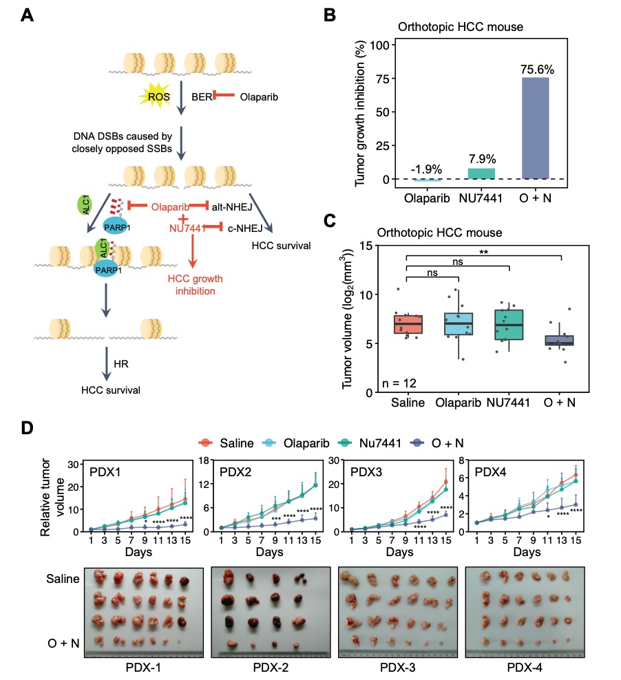 为探究 HR 和 NHEJ 在癌组织中提升的原因,研究团队检测了小鼠癌组织及癌旁组织中DSB修复通路中各蛋白的表达情况,发现关键修复因子PARP1 和 DNA-PKcs 的表达显著提升。而团队成员利用大量临床标本进一步验证发现,上述两种蛋白在人类肝细胞癌中依然呈现明显的表达上调,暗示其在DSB修复的激活和肝细胞癌发展维持中扮演了重要角色。进一步研究显示,利用PARP1 抑制剂olaparib 和 DNA-PKcs 抑制剂NU7441同时处理肝细胞癌细胞可以极大地抑制其 HR 和 NHEJ 修复能力。更为重要的是,联合应用olaparib 和NU7441,或同时敲降 PARP1和DNA-PKcs都可协同抑制肝细胞癌细胞的增殖,证明二者可作为治疗肝细胞癌的潜在靶标。后续的机制研究发现,olaparib 可通过抑制 PARP1酶活,从而阻碍 ALC1 在损伤位点的募集,继而延缓损伤位点周围核小体的清除,最终抑制 RPA2 和 RAD51 在损伤位点的招募。最后,研究团队基于小鼠原位肝细胞癌和人肝细胞癌PDX模型,进一步证实了olaparib 和 NU7441 联用通过靶向DSB修复以治疗肝细胞癌的巨大潜力(图2)。