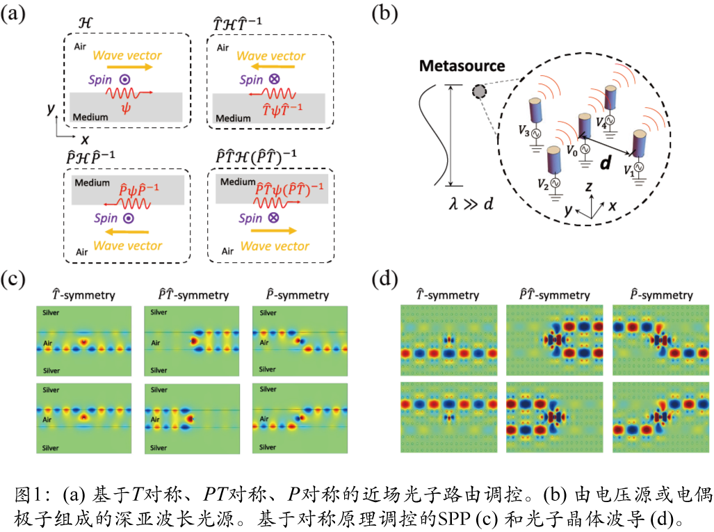 对称性是物理学中含义最深刻的概念之一。该研究揭示了对称性在近场光子学中的重要性。近场光子学因其从经典领域到量子领域的广泛应用而备受关注,目前已经成为信息通信和能量传输的重要桥梁之一。论文从理论和实验上研究了基于时间反演(T)对称、宇称-时间反演(PT)对称、宇称(P)对称的近场光子路由调控(如图1(a)所示)。从对称性出发,可以设计一种仅由电压源或电偶极子组成的光源(如图1(b)所示),从而克服传统光源需要磁偶极子的局限性。论文中提出的基于对称性的近场光子路由调控原理具有普适性,可应用于SPP(如图1(c)所示)、光子晶体波导(如图1(d)所示)、介质波导等各种波导系统中,为将来集成光学与光子学器件的研制提供了新机理。