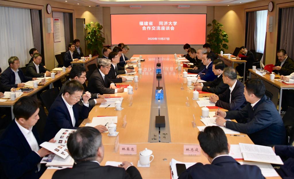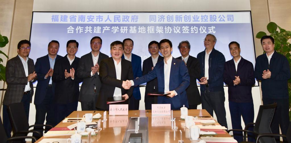 座谈会上,在省校双方领导的见证下,福建省南安市人民政府和同济创新创业控股有限公司签署了合作共建产学研基地框架协议。