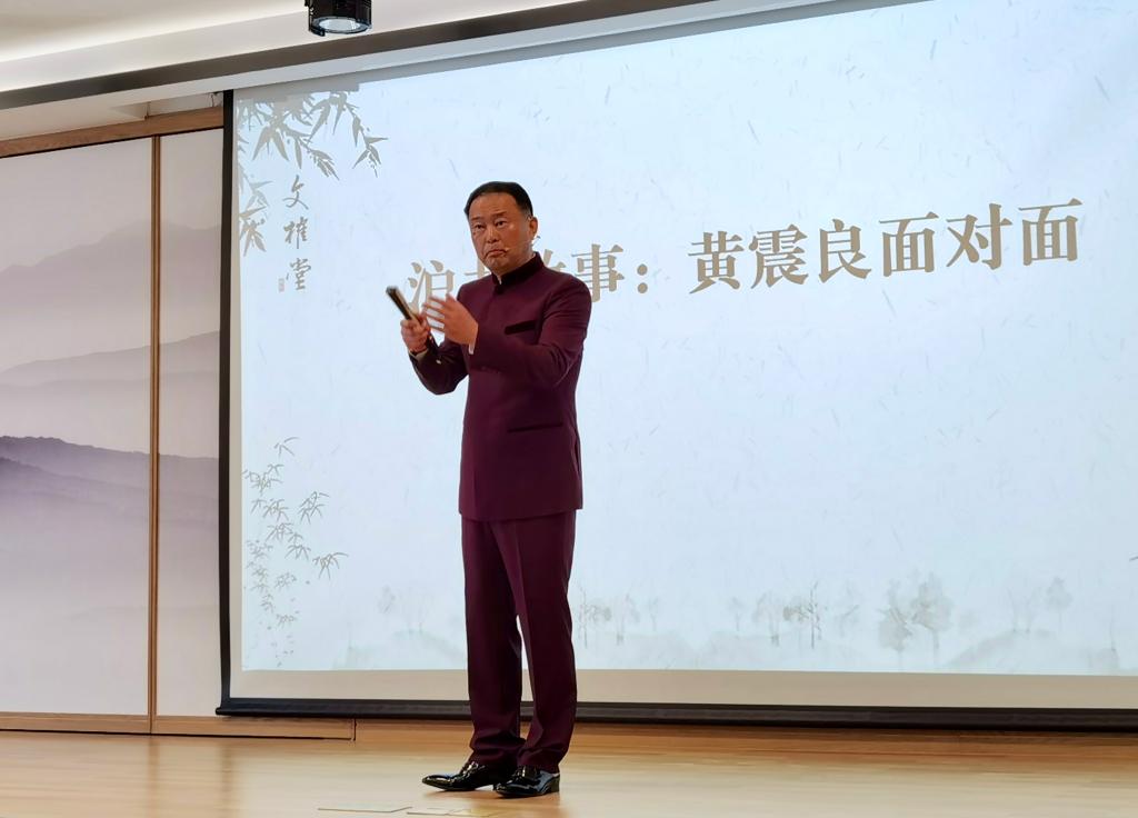 另一位做客“戏曲曲艺名家谈”的是沪书传承人、上海市曲艺家协会副主席黄震良。他为学子开讲“沪书故事”,讲述了如今沪书在发展中遭遇的现实困境,以及上海曲艺界为上海话的普及与传承所开展的工作和付出的努力。他还现场表演了自己创作的沪书经典剧目。
