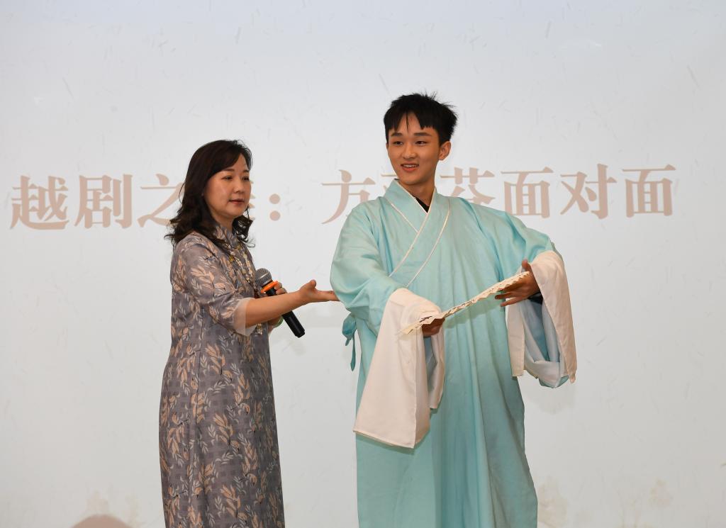国家一级演员、著名越剧表演艺术家方亚芬与同济师生面对面,畅谈“越剧之美”。她简要介绍了越剧百余年的发展历程以及越剧四大经典剧目,献唱了越剧《西厢记·琴心》经典选段,带领师生领略越剧艺术之美。3位青年越剧演员表演了越剧《红楼梦》《祥林嫂》选段。方亚芬还对我校越剧社学生赵艺茗、韦赛蕾的唱段表演进行指导。学生还体验了台步、水袖、手势等越剧形体语言之魅力。