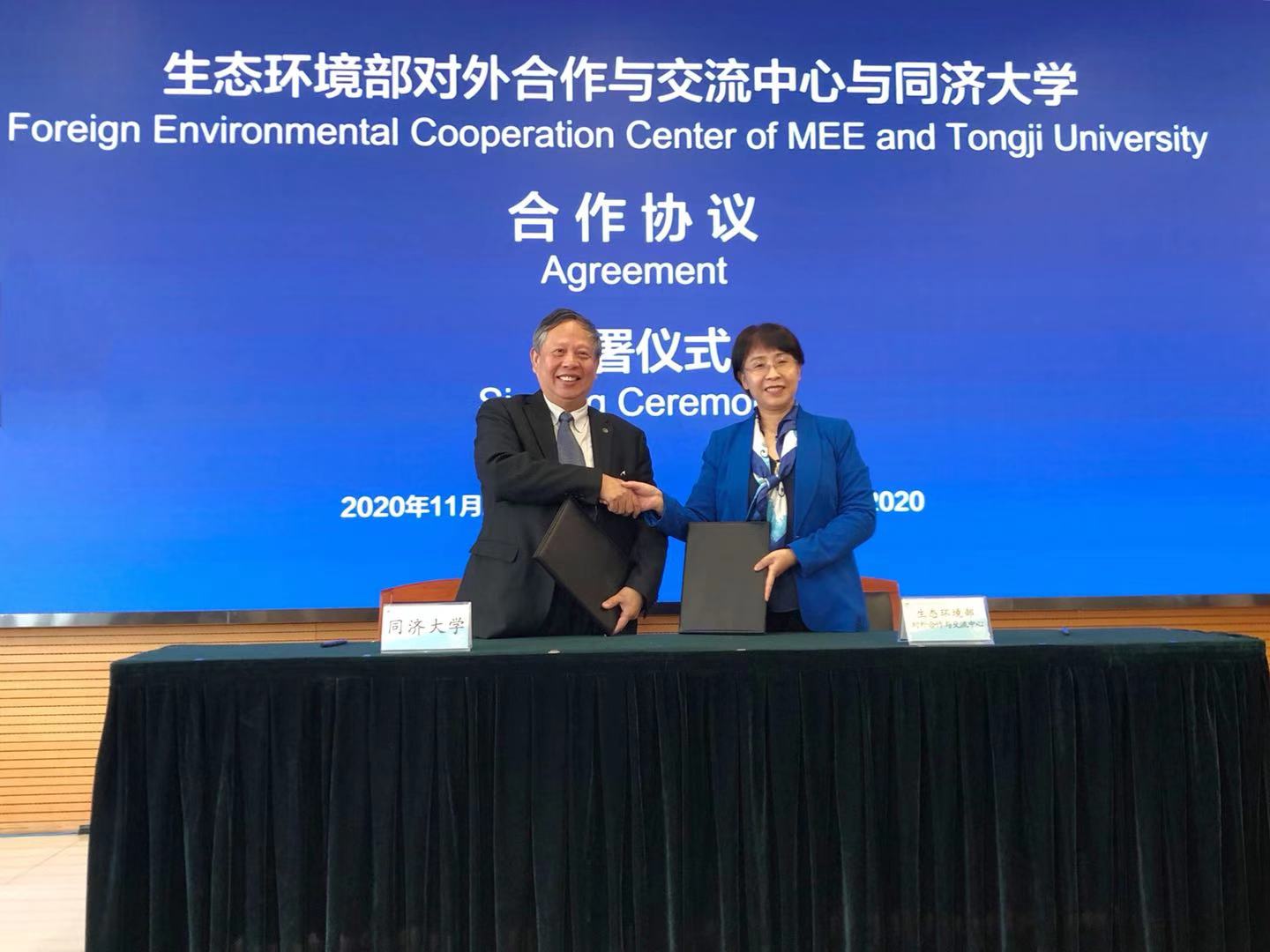 会上,我校和生态环境部对外合作与交流中心签署合作协议,双方将加强在生态环境领域的国际合作,内容包括推动绿色“一带一路”建设、促进区域生态环境治理、建立健全区域环境合作网络、开展区域可持续环境规划联合研究、提升生态环境保护能力建设,以及加强中非环境政策与技术合作。伍江与周国梅分别代表双方签署协议。