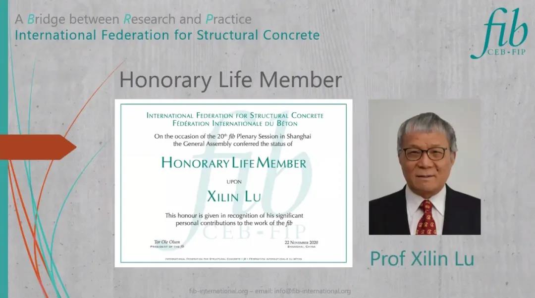 11月22日,国际结构混凝土协会 (fib ) 2020年国际学术大会在上海召开,会议采用线上与线下相结合的形式。开幕式上,国际结构混凝土协会主席Tor Ole Olsen先生为中国工程院院士、我校土木工程学院教授吕西林颁发“fib 终身荣誉会员”奖,以表彰他在混凝土结构理论研究和工程应用方面所取得的学术成就,以及对国际结构混凝土协会作出的突出贡献。国际结构混凝土协会每年评选“终身荣誉会员”奖一名。吕西林院士是首位获得国际结构混凝土协会年度重要奖项的中国学者。
