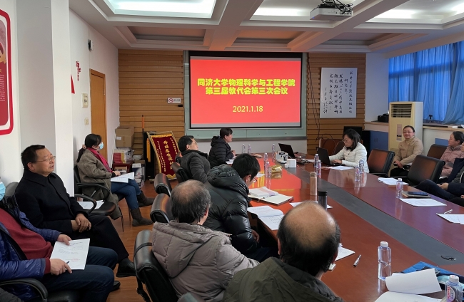 2021年1月18日,同济大学物理科学与工程学院第三届教代会第三次会议召开。会议听取了学院行政工作报告、财务工作报告、工会工作报告,还高票通过了与学院教职工切身利益直接相关的《物理学院绩效分配方案》。