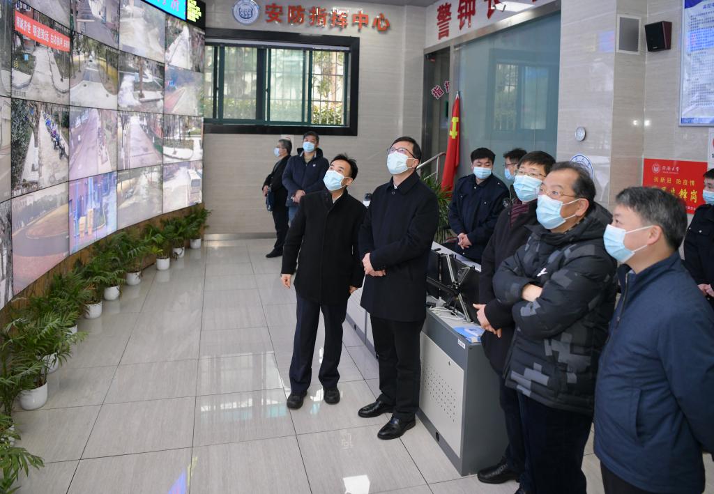 “感谢大家,各位辛苦了!”2月11日上午,陈杰一行先后来到学苑饮食广场、留学生一号楼、学五楼、保卫处安全防范指挥中心、校医院、赤峰路50号和67号门口,向在岗的厨师、宿舍管理人员、保卫人员、医护人员表示亲切慰问,向他们送上新年大礼包,感谢他们的辛勤劳动,希望他们继续坚守岗位,为留校学生做好各项服务。在安防指挥中心,陈杰还通过安防监控系统大屏幕,了解各校区、实验室情况,希望保卫处严格落实各项安保措施,保校园一方平安。