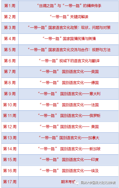 《“一带一路”文化经典解读》由我校国际文化交流学院院长孙宜学牵头,课程团队包括蔡琳、陈毅立、程妤、宋黎磊、叶澜等教师 。该课程旨在通过对“一带一路”沿线国家的语言与文化进行解读,让学生对“一带一路”倡议的内涵与外延等有基本的理解和把握,从而拓宽学生的国际化视野与跨文化交际能力。在这门课中,不仅将有同济专家深入浅出地讲解“一带一路”倡议的历史、现在与未来,中外人文交流的技巧与方法,还有海外学者为学子讲解“一带一路”沿线国家的语言与文化。课程共包括16讲,其中有10讲是关于英国、德国、意大利、法国、俄罗斯、美国、加拿大、新加坡、印度、埃及10个国家的国别语言文化解读。