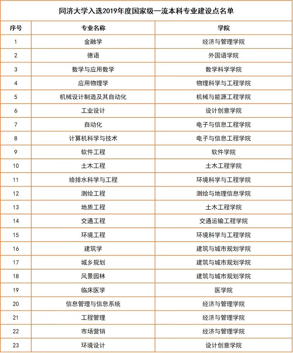 同济大学此前已入选2019年度国家级一流本科专业建设点的23个专业分别是:金融学、德语、数学与应用数学、应用物理学、机械设计制造及其自动化、工业设计、自动化、计算机科学与技术、软件工程、土木工程、给排水科学与工程、测绘工程、地质工程、交通工程、环境工程、建筑学、城乡规划、风景园林、临床医学、信息管理与信息系统、工程管理、市场营销、环境设计。此外,工程力学、材料科学与工程两专业,入选2019年度省级一流本科专业建设点。