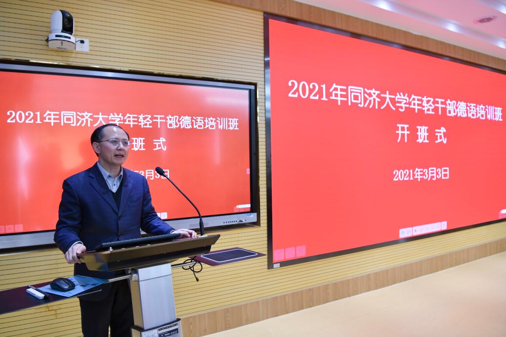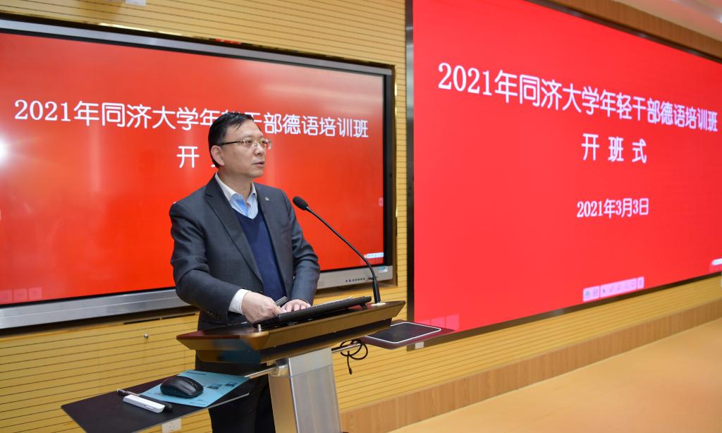 3月3日下午, 2021年同济大学年轻干部德语培训班开班。校党委书记方守恩出席开班仪式并讲话,校党委常务副书记冯身洪主持,副校长黄翔峰,以及校党委组织部、外国语学院负责人和25名参训学员出席。