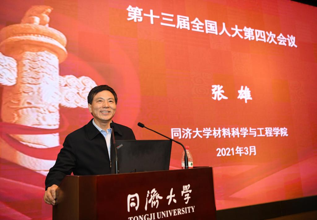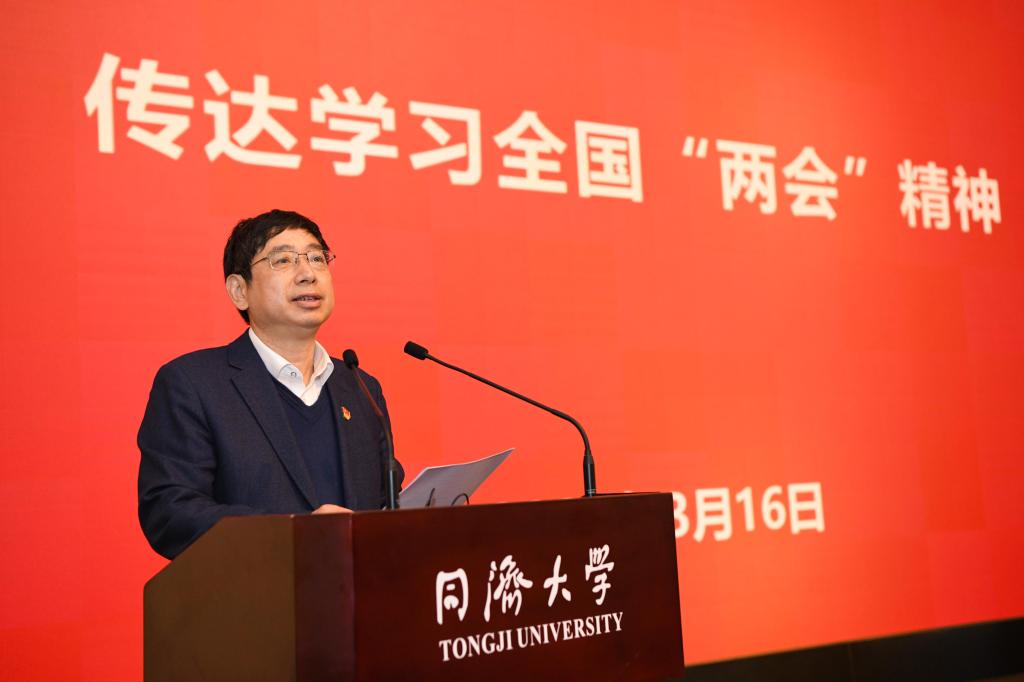 3月16日下午,同济大学举行党委理论学习中心组(扩大)专题报告会,传达学习全国两会精神。校党委书记方守恩等校党委理论学习中心组成员,全校中层干部和民主党派教师代表等300余人出席报告会。报告会由校党委副书记吴广明主持。