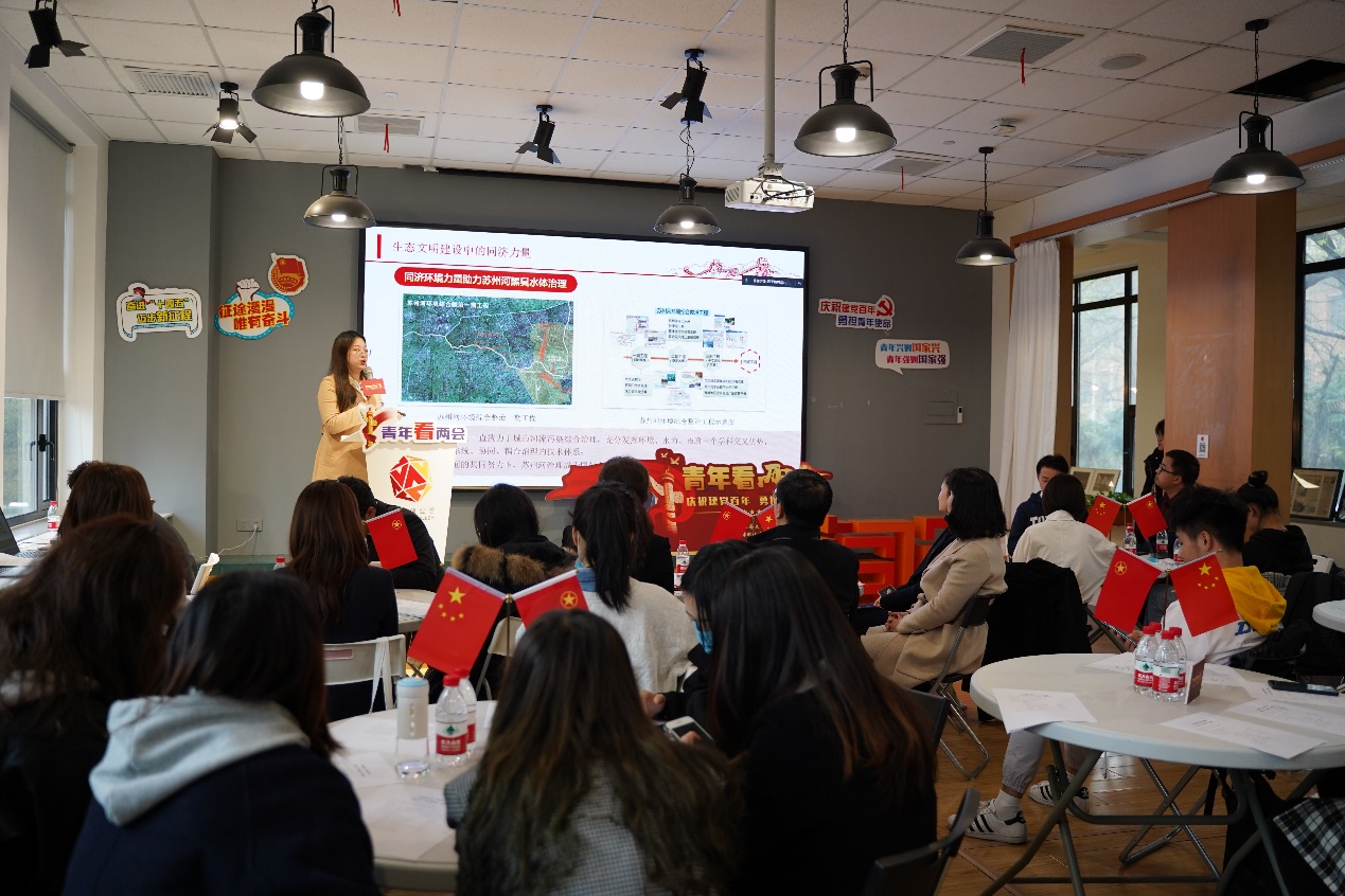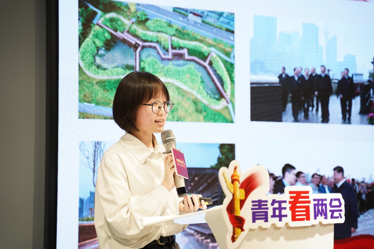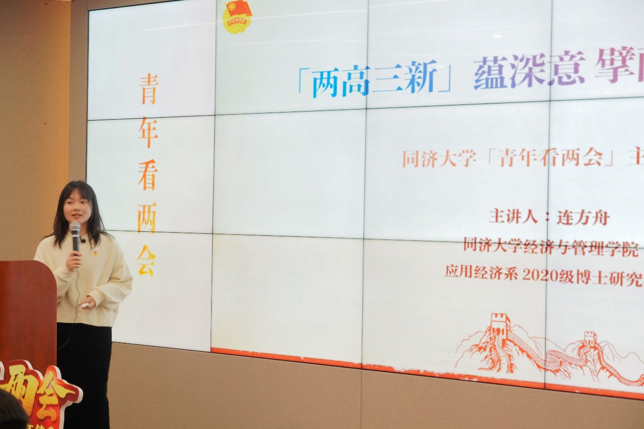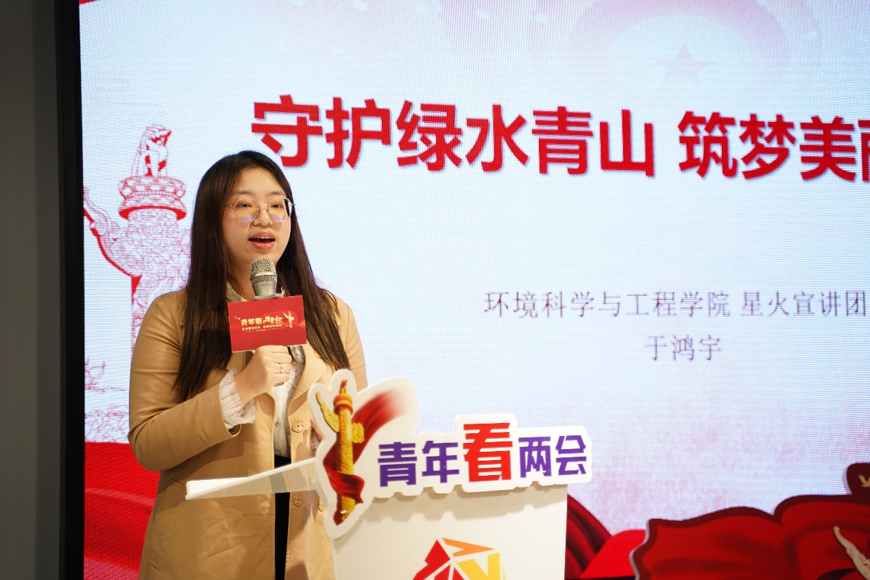环境科学与工程学院硕士研究生于鸿宇结合专业知识分享了对今年两会有关生态文明建设的认识,讲解了两会热词“碳达峰”和“碳中和”的概念,号召同济学子要聚焦国家重大需求,突破环境保护与生态文明建设重大关键技术,为服务国家重大战略贡献青春力量。