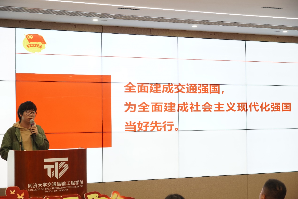 交通运输工程学院硕士研究生朱海星对《国家综合立体交通网规划纲要》进行了深刻解读,介绍了其中彰显出的同济智慧与同济担当,号召同济学子为加快建设交通强国当好先行军。