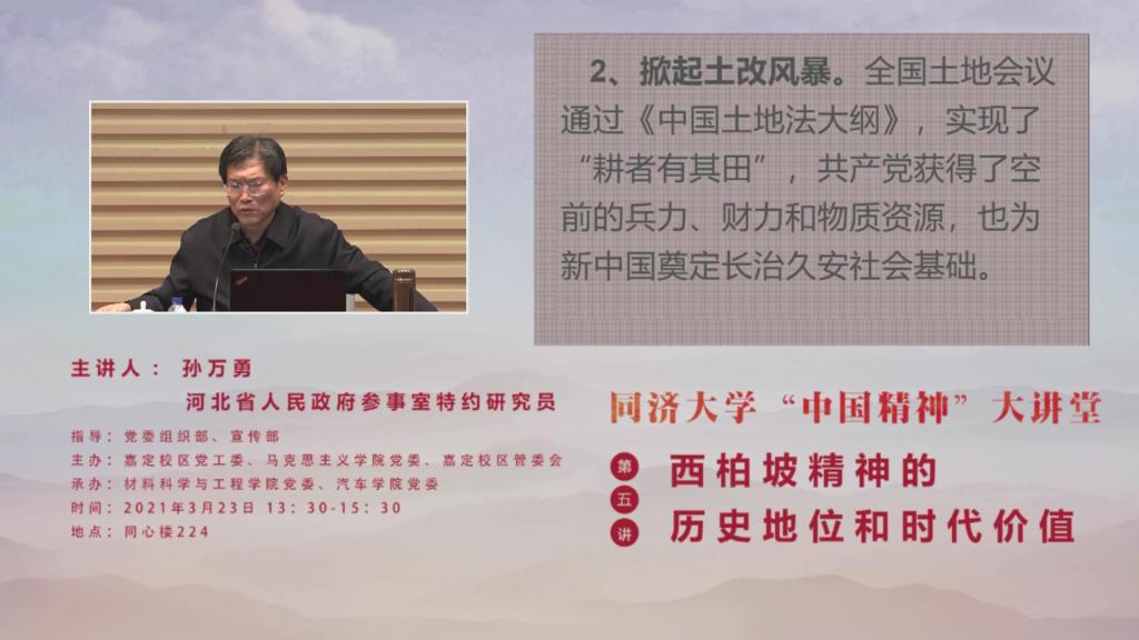 3月23日,同济大学“中国精神”大讲堂第五讲在嘉定校区开讲, 河北省人民政府参事室特约研究员孙万勇教授应邀为师生作了题为《西柏坡精神的历史地位和时代价值》的精彩报告。嘉定校区党工委、材料科学与工程学院党委、汽车学院党委负责人及嘉定校区师生160余人现场听讲。同济大学官方微博、抖音、快手和B站1万余人次同步收看直播。