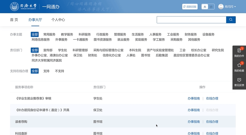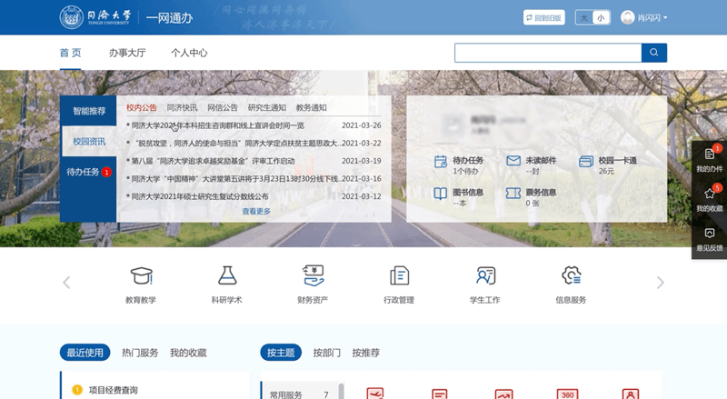当天,作为“我为师生办实事”主题实践活动的一项具体举措,同济大学“一网通办”开通试运行。校信息化办公室负责人介绍,学校以“线上一网通办,线下只跑一次”为目标建设“一网通办”门户,现已完成PC端开发部署并试运行(https://all.tongji.edu.cn),移动端开发正稳步推进。 “一网通办”作为学校为师生服务的窗口,在部门协同、师生共创的治理生态下,缓解系统小散乱现象,提升师生用户体验,助推实现“一网通办提升信息服务能力,一网统管提高运营管理能力”目标。“一网通办”门户具有服务事项展示、在线服务办理、师生意见反馈、服务运营情况监测等功能,已梳理并迁移服务事项210余项,涉及18个部门,新建新进教师入职、高级专家延聘等在线服务近10项,还整合了主要部门的网站和信息系统。学校将持续梳理明确工作机制,同时探索基于人工智能、超自动化的主动服务,构建师生共创生态,推动“一网通办”成为“一网好办”。