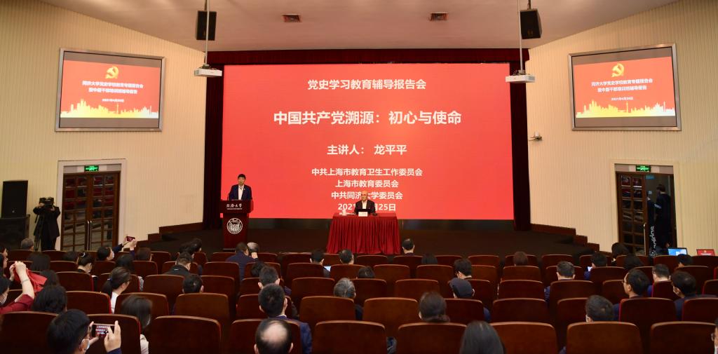 作为上海市教卫工作党委、市教委与同济大学联合开展的一次重要学习活动,4月25日上午9时,龙平平教授在同济大学作了题为《中国共产党溯源:初心与使命》的党史学习教育专题辅导报告。上海市教卫工作党委、市教委处长和支部书记,同济大学校领导、中层干部,以及上海市大学生理论宣讲联盟成员代表数百人在同济大学逸夫楼现场聆听了报告。此次报告会也是同济大学理论学习中心组扩大学习会和中层干部培训班辅导报告会。