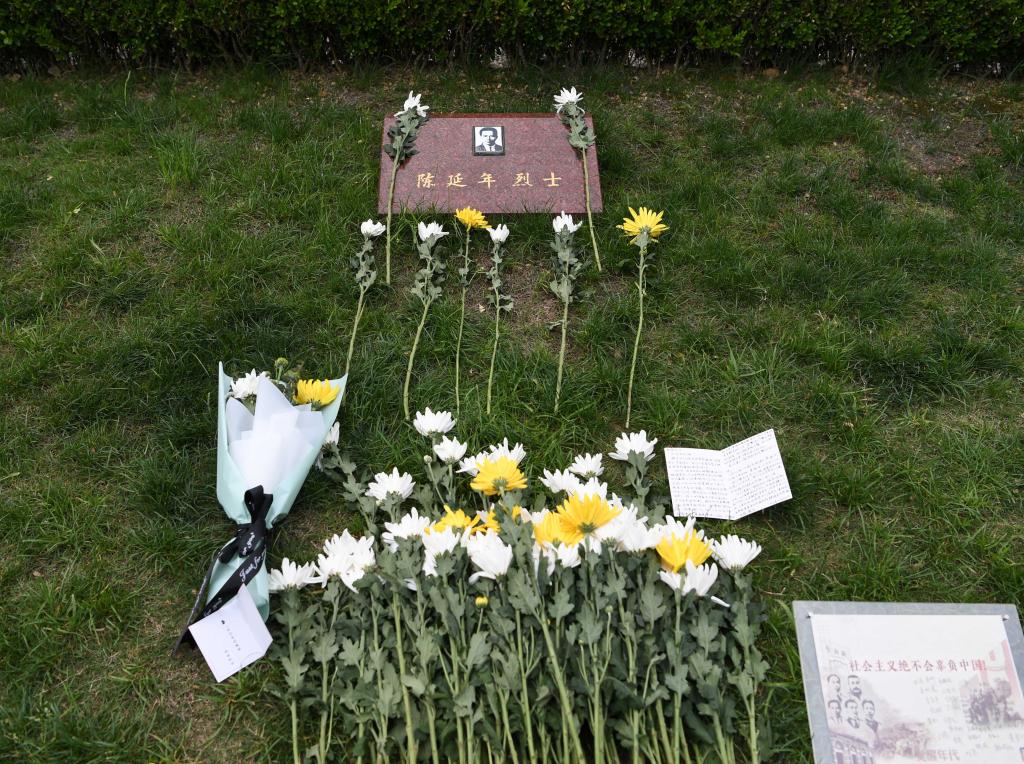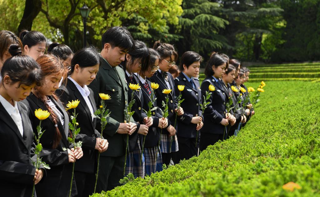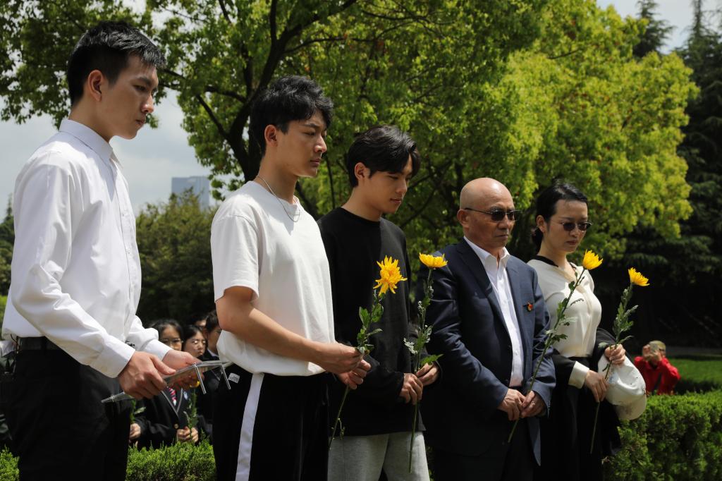 4月25日中午,龙华烈士陵园内,一派庄严肃穆的氛围。在烈士墓区,龙平平教授,青年演员张晚意、马启越,带领同济大学及上海市大学生理论宣讲联盟成员单位的75名学生代表,手持一枝枝素洁的菊花,分别来到陈延年、陈乔年两位烈士的墓碑前,默哀、鞠躬、献花,向烈士们表达深切的缅怀和崇敬之情。