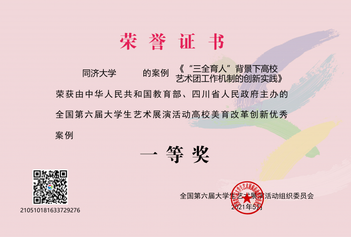 5月11日至12日,由教育部、四川省政府共同主办的全国第六届大学生艺术展演活动高校美育改革创新优秀案例报告会在四川成都举行。我校选送的两篇案例《“三全育人”背景下高校艺术团工作机制的创新实践》《及人之美,教化于艺——同济大学艺术与传媒学院美育改革创新优秀案例》荣获高校美育改革创新优秀案例一等奖。