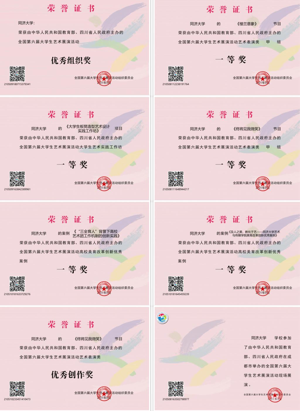 5月12日,全国第六届大学生艺术展演活动在成都圆满落幕。我校入围现场展演的民乐合奏《楼兰意象》、舞蹈《终将见我微笑》、板凳造型艺术设计实践工作坊及两案例《“三全育人”背景下高校艺术团工作机制的创新实践》《及人之美,教化于艺——同济大学艺术与传媒学院美育改革创新优秀案例》5个项目,均获得全国一等奖。此外,舞蹈《终将见我微笑》获优秀创作奖,我校获得优秀组织奖,展演总成绩位列上海高校之首,在全国高校中名列前茅。