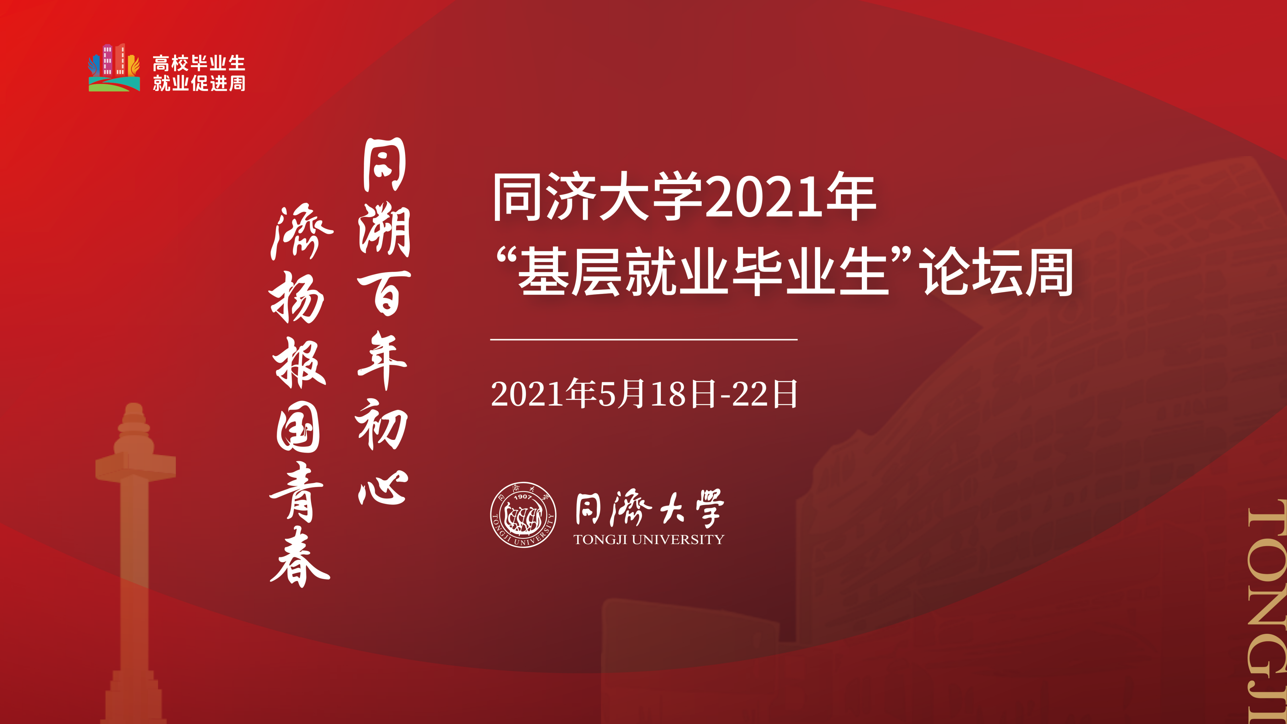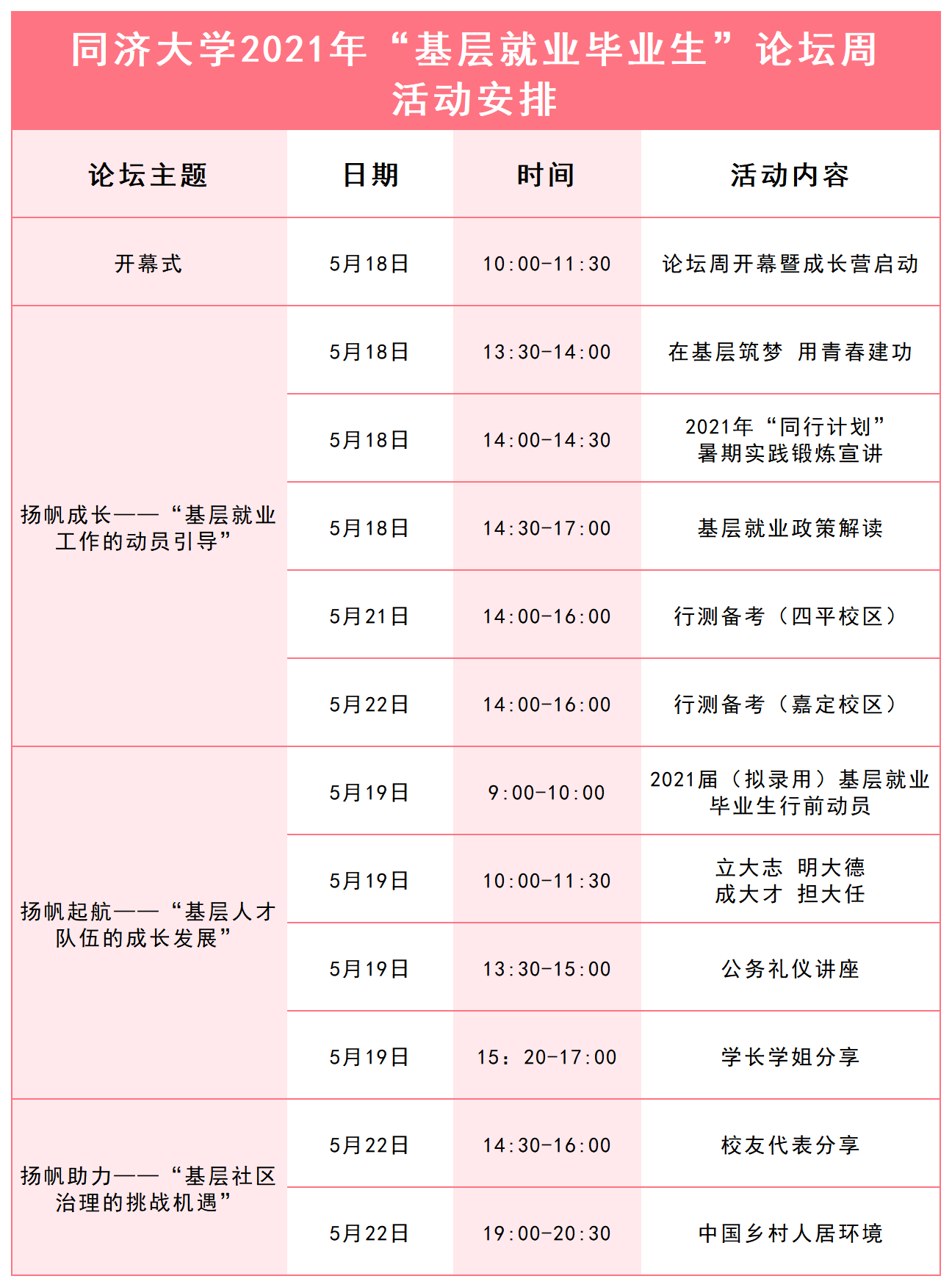 相关负责人表示,此次论坛周采用线上线下相结合的方式,旨在打造基层就业校友交流工作经验、社会阅历和成长感悟的大舞台,帮助有志于从事党政基层工作的在校学生坚定理想信念,拓宽择业格局。接下来,学校将陆续开展“扬帆成长”“扬帆起航”“扬帆助力”分论坛活动,分别面向2022届“扬帆成长营”营员、2021届(拟录用)基层就业毕业生和同济大学历届基层就业校友,举办政策解读、2021年“同行计划”暑期实践锻炼宣讲、校友分享沙龙、专家讲座、岗前培训等10余场活动。论坛周将持续至5月22日。