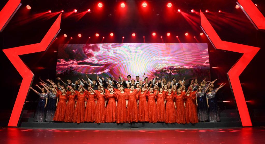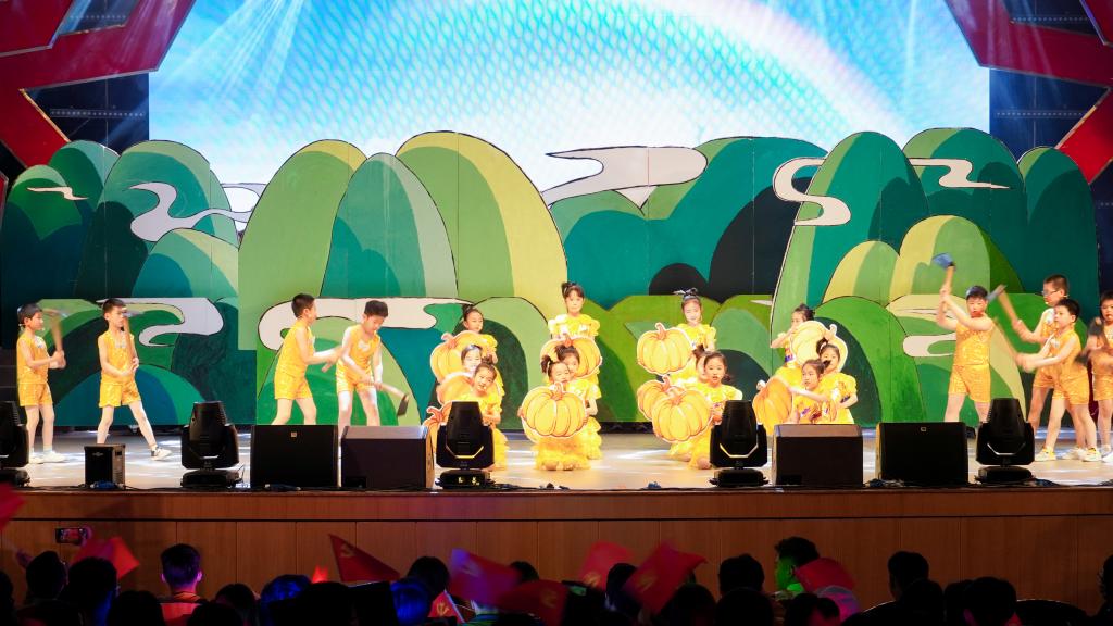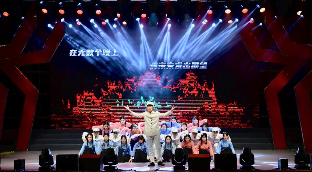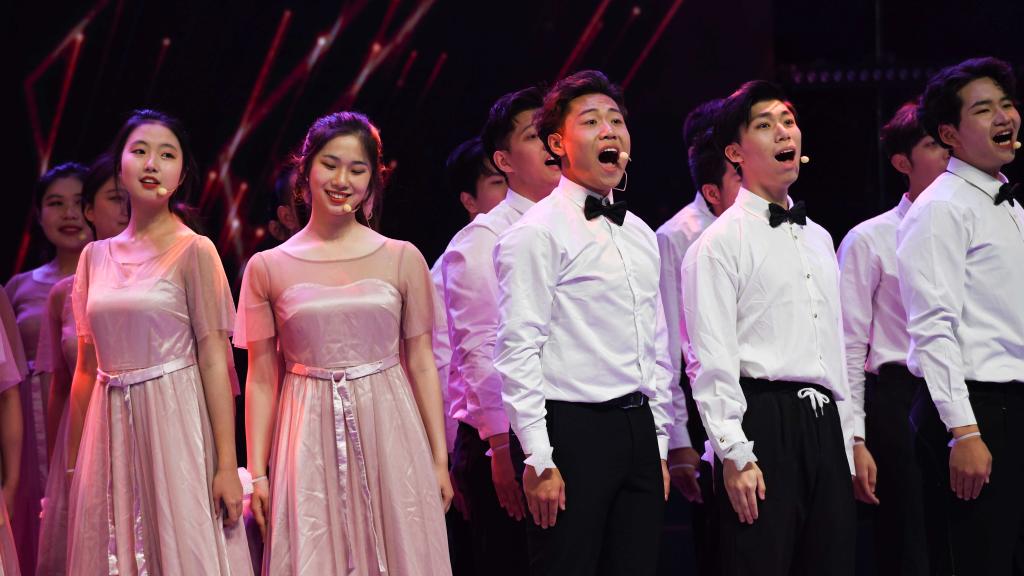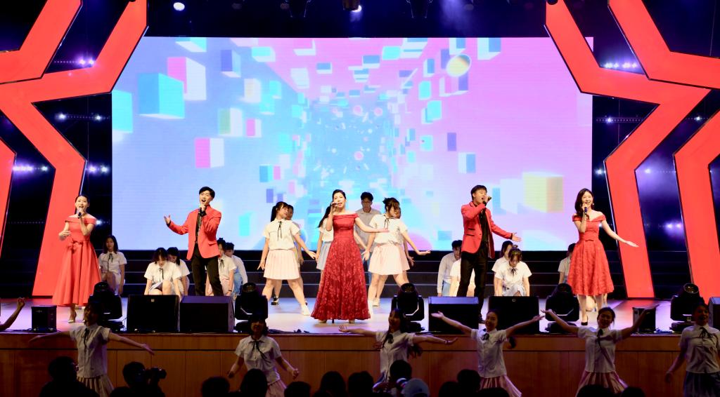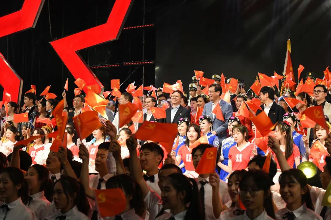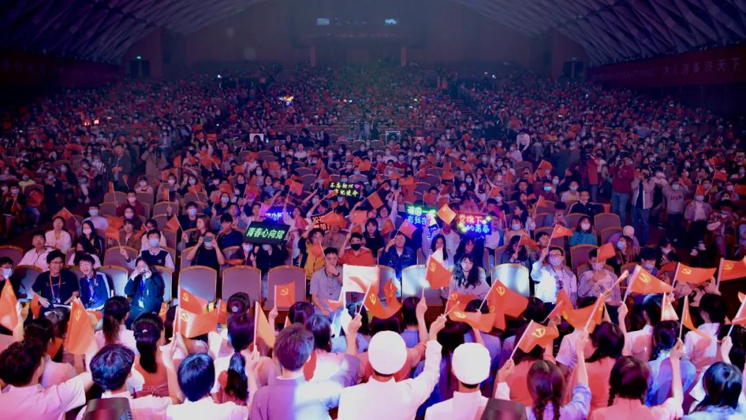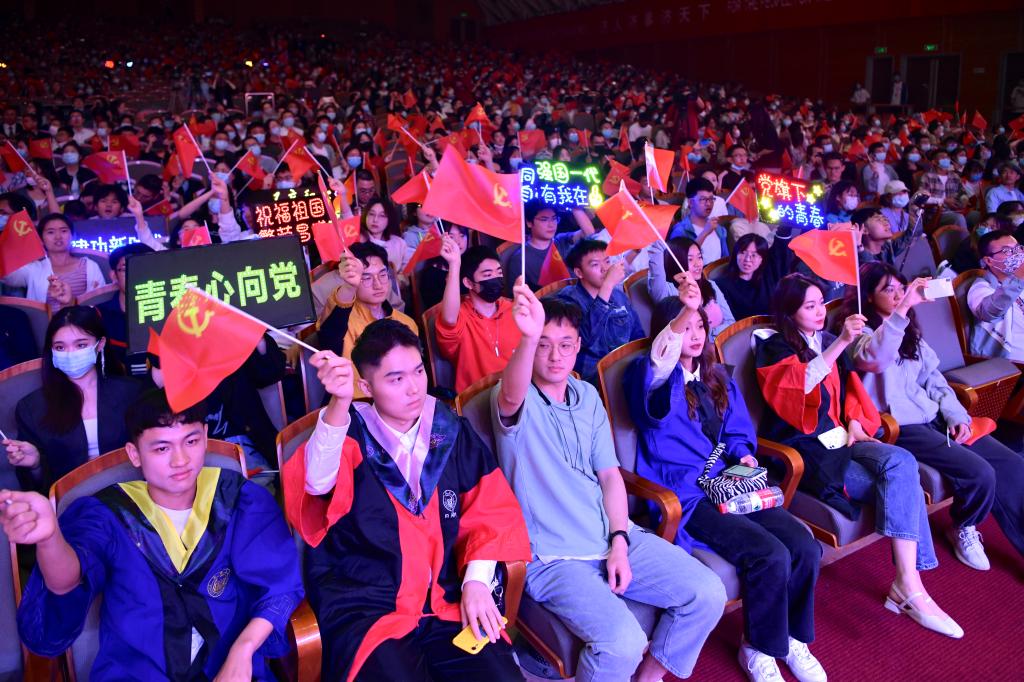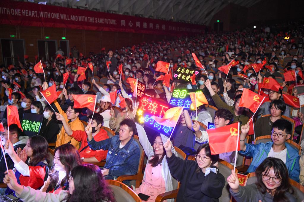 大礼堂内,一阵阵掌声此起彼伏。青年学生挥舞着手中的党旗,举起“青春心向党”“强国有我在”“党旗下的青春”等表达心声的标语牌,伴随着一首首经典旋律,为表演者喝彩,为祖国祝福。