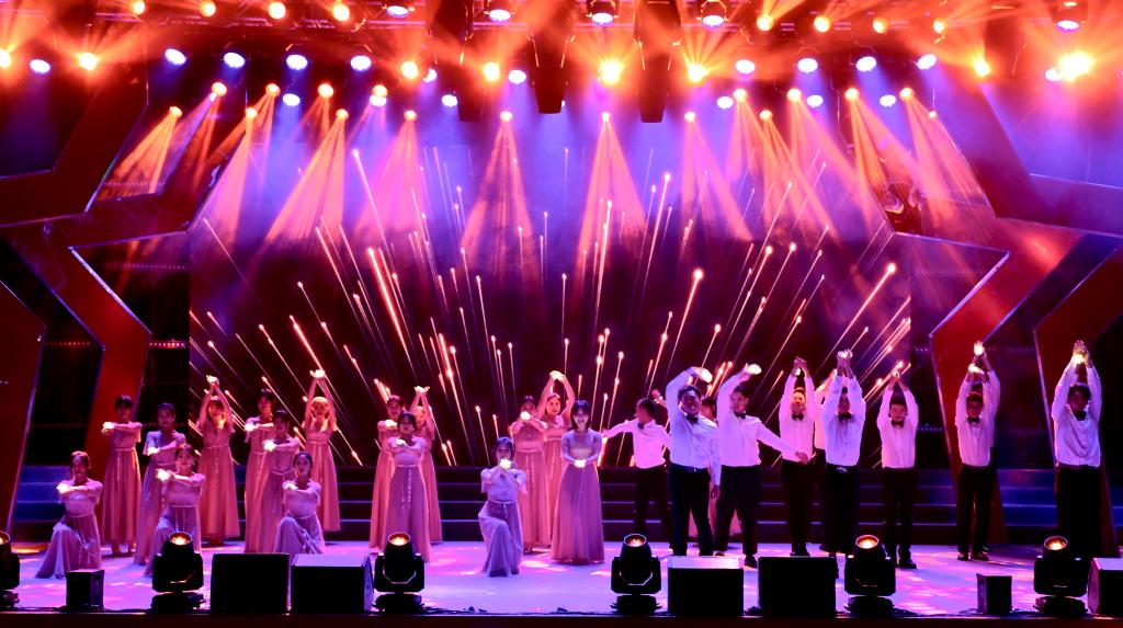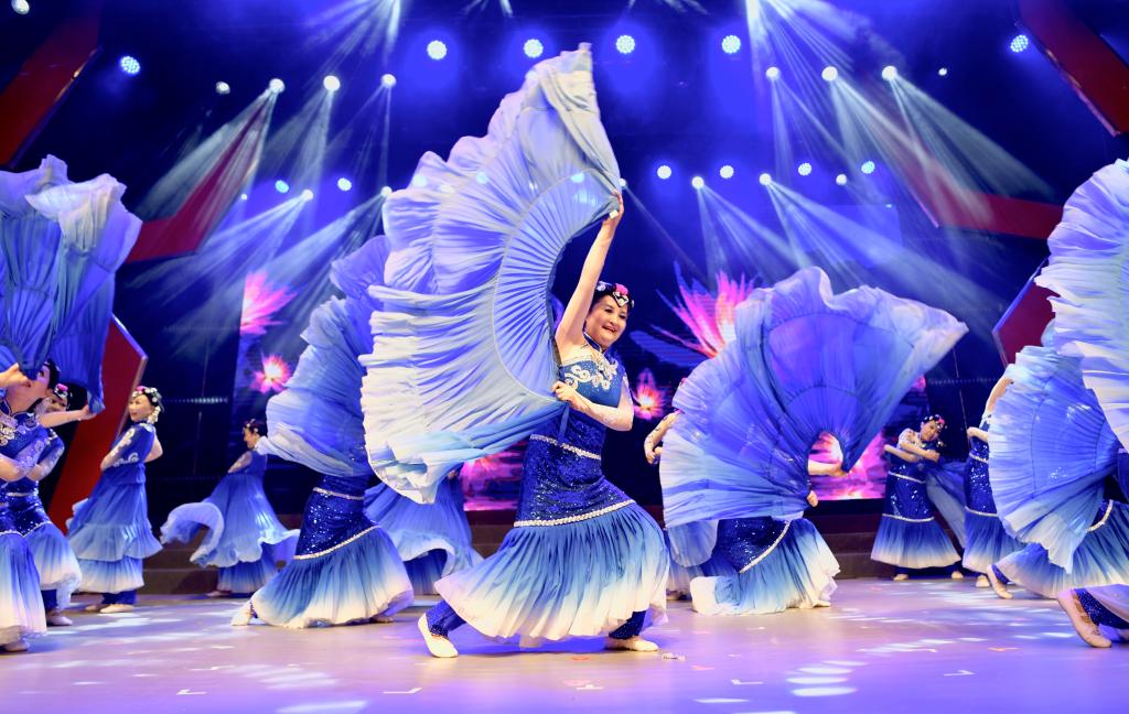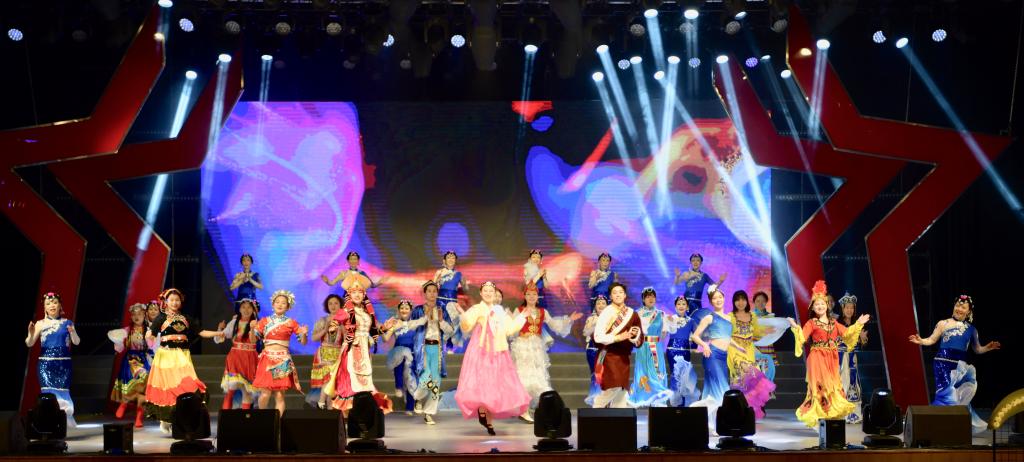 由平均年龄62岁的老年艺术团舞蹈队和各民族学生代表倾情献演的舞蹈《石榴花开》,呈现了一幅各民族像石榴籽一样紧紧抱在一起,团结奋斗、繁荣发展的美好和谐画卷。