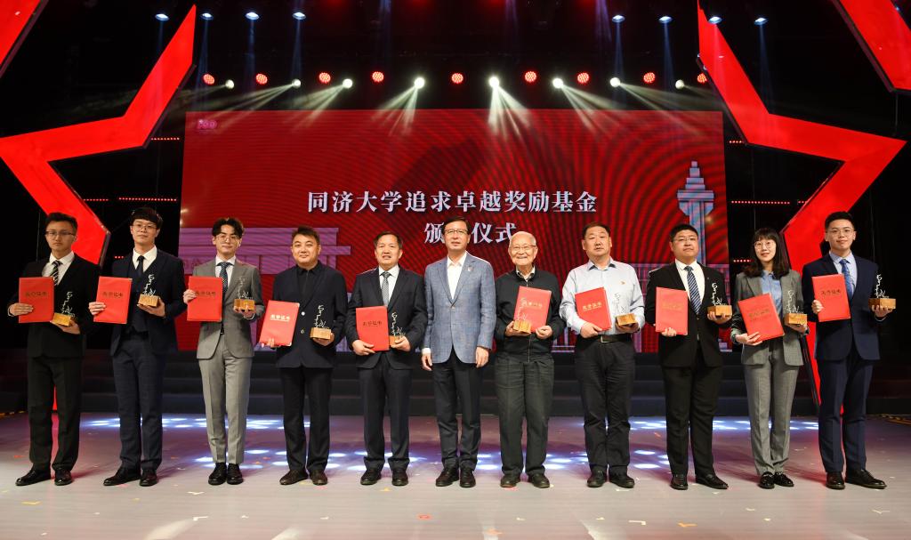 校长陈杰为2021年“同济大学追求卓越奖”获奖者颁奖,汪品先、戈宝学、石振明、陈雪峰、刘佳琦、陈羿、张喆、郑雪莹、陈御、辛旭10位师生校友分获“追求卓越教师奖”“追求卓越服务奖”“追求卓越校友奖”“追求卓越学生奖”。现场师生用经久不息的掌声,向汪品先院士等获奖者表达由衷的敬意。