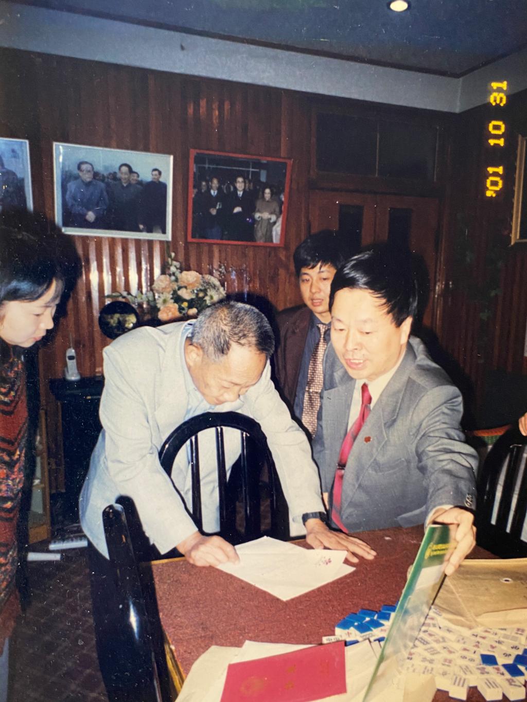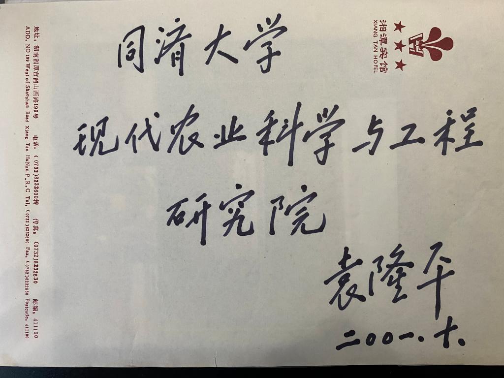 2001年10月30日,时任同济大学现代农业科学与工程研究院负责人的我,接受了同济大学时任校长吴启迪教授交给的任务,带着校长的亲笔信,乘火车前往湖南长沙袁隆平院士的家中,呈送同济大学聘请袁隆平院士为名誉教授的聘书。次日到达长沙火车站时,袁老派身边的工作人员前来接站,随后我们径直来到袁老的家中。见到袁老的第一眼我就被震撼到了,他衣着非常朴素,身材偏瘦肤色偏黑,看上去就像一位老农民。我进门时,看见有几个农民正在向袁老请教水稻的相关技术问题,他和农民们在一起就像一家人一样,若不是陪同人员介绍,我还真分不清楚哪位是袁老。
