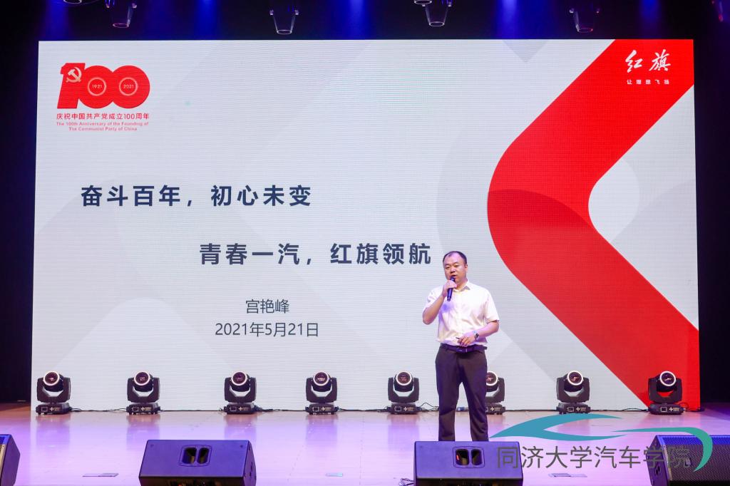 晚会上,6位汽车企业优秀青年代表和2位汽车学院青年教师作主题演讲。一汽集团研发总院动力总成部宫艳峰以《奋斗百年,初心未变 青春一汽,红旗领航》为题,介绍了一汽经典品牌——红旗的改革与创新故事,鼓励青年大学生加强培养个人能力和创新意识,不断提升自我。东风汽车集团有限公司陈虹吉以《百年大党,风华正茂;半百东风,仍是少年》为题,讲述了东风汽车建厂初期的艰辛和抗疫中“最飒逆行车”的故事,展现了东风人不屈不挠的“马灯精神”。重庆长安汽车股份有限公司王金汶以《百年复兴路,世纪长安颂》为题,讲述了长安汽车在党旗下实业兴邦、千里西行、结缘汽车、自立自强、不断发展的故事。北汽蓝谷麦格纳汽车有限公司赵鹏以《两个奋斗者伙伴,一部世界级好车》为题,讲述了北汽党委如何把方向、管大局、保落实,积极促进企业发展的历程,并介绍了北汽与华为合作研发无人驾驶系统的情况。上汽乘用车公司霍飞蛟以《建筑·汽车·跨界》为题,介绍了上汽“R”汽车将中华传统文化融入现代汽车设计美学的故事。吉利汽车研究院有限公司张晓龙以《极氪出发,御风前行》为题,分享了吉利新款车型极氪001中的研发故事。来自汽车学院的青年教师代表冷搏及蔡黎明分别作了题为《一颗初心 一纪同行》和《中国梦 汽车魂》的主题演讲。冷搏分享了他在同济汽车学院求学、工作十二载的所思所悟。蔡黎明讲述了他从汽车学院本科毕业、海外留学后再返校任教、培育汽车人才的故事。