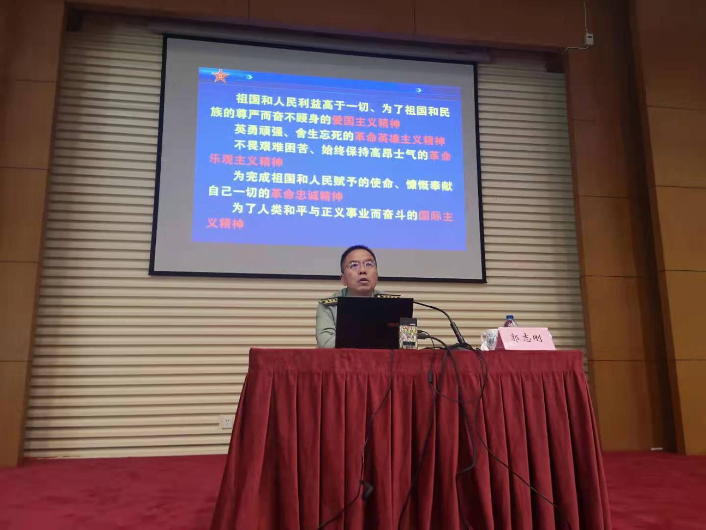 郭志刚以抗美援朝战争的重大历史事件为视角,运用生动翔实的历史资料和文献资料,围绕“进一步高扬爱国主义旗帜”“进一步增强不畏强敌、制胜强敌的精神和心理优势”“进一步强化一不怕苦、二不怕死的战斗精神”“进一步营造创新创造的浓厚氛围”“进一步汇聚全民族的磅礴力量”五个方面,全面回顾和生动展示了新中国成立初期的时代背景、党中央作出中国人民志愿军出国作战的决策部署、艰苦卓绝的战斗过程和中国人民志愿军的英雄事迹、抗美援朝战争的宝贵经验和伟大的历史意义。同时,他结合对抗美援朝战争史的深度讲解,全面系统地向大家阐释了习近平总书记在纪念中国人民志愿军抗美援朝出国作战70周年大会上的重要讲话精神,使与会师生更加深刻体会到中国人民志愿军伟大的革命精神和斗争精神,更加深刻认识到抗美援朝战争的伟大胜利和巨大贡献,更加深刻领会和把握伟大抗美援朝精神的历史意义和时代价值。