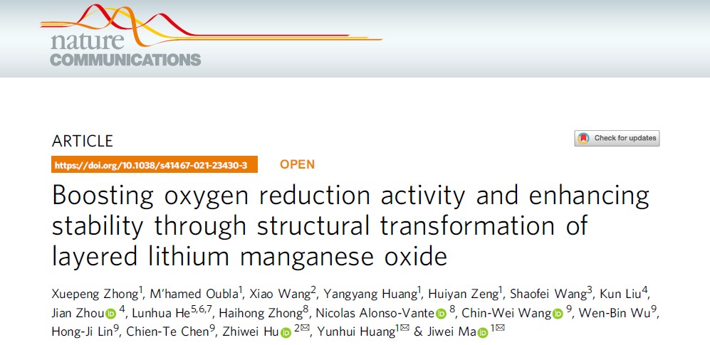 5月25日,材料科学与工程学院车用新能源研究院马吉伟教授、黄云辉教授团队在国际知名学术期刊《自然·通讯》(Nature Communications)上在线发表了题为“Boosting oxygen reduction activity and enhancing stability through structural transformation of layered lithium manganese oxide”的研究论文。该研究基于缺陷调控,利用质子交换的策略有序调控锰基材料的不稳定氧浓度和层间距,用于提升材料的催化活性和稳定性。该论文分别从材料的结构转变、电子特性和电化学性能等多个方面全面表征了调控前后锰基氧化物电催化剂的各项特征。研究发现了不稳定氧浓度和层间距对锰基材料催化稳定性和活性之间的关联性,同时该策略可以应用于其他含碱金属的层状金属氧化物材料,为构筑高性能氧还原反应非贵金属氧化物提供了新的设计思路。