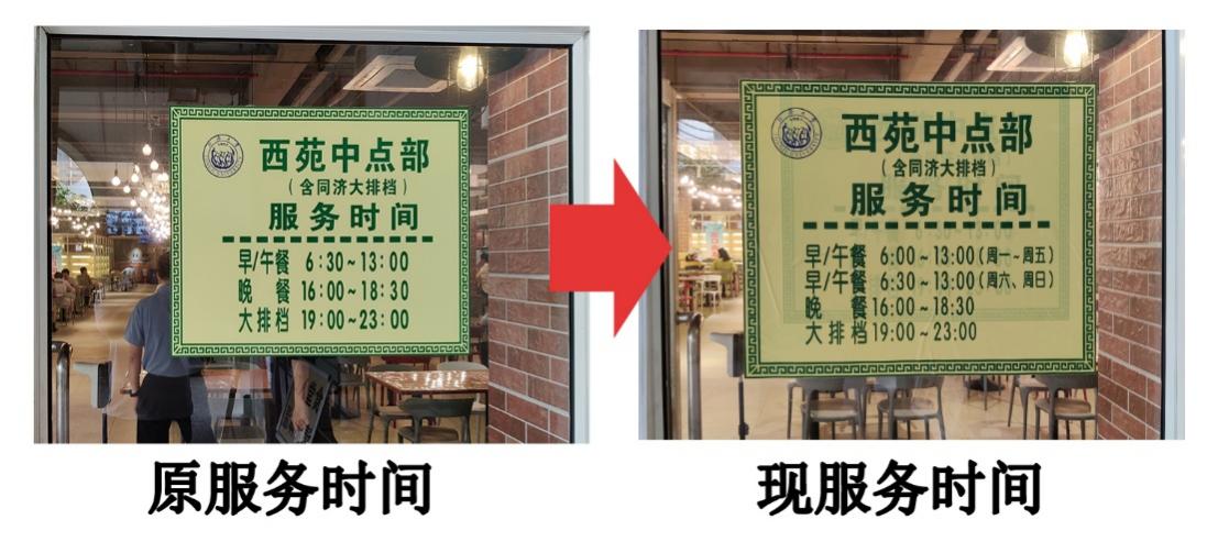 调整西苑中点部早餐供应时间。为了解决从四平校区乘坐首发班车前往嘉定校区工作和学习的师生们的早餐用餐问题,四平校区西苑中点部自5月18日起将营业时间从早上6:30提前至6:00,以便师生能够在乘坐班车之前享用完早餐,以良好的状态迎接一天的工作和学习,切实满足师生们的实际需求,增加师生的满足感和幸福感。