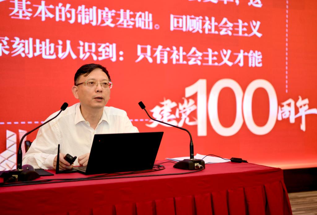 随后,方守恩分别从新民主主义革命时期、社会主义革命和建设时期、改革开放新时期和中国特色社会主义新时代四个历史时期,回顾了党的百年奋斗历程。在讲述每个历史阶段的党史时,他还讲述了该阶段同济大学党组织的发展情况,以及同济人在党的坚强领导下,始终秉持“与祖国同行、以科教济世”优良传统,主动发挥学科人才优势,在各个不同历史时期为党和国家事业发展作出的重要贡献。同济校史上一个个杰出的人物、一幅幅珍贵的老照片、一段段生动的影像资料、一个个鲜活的奋斗故事,令师生们倍感亲切和自豪。