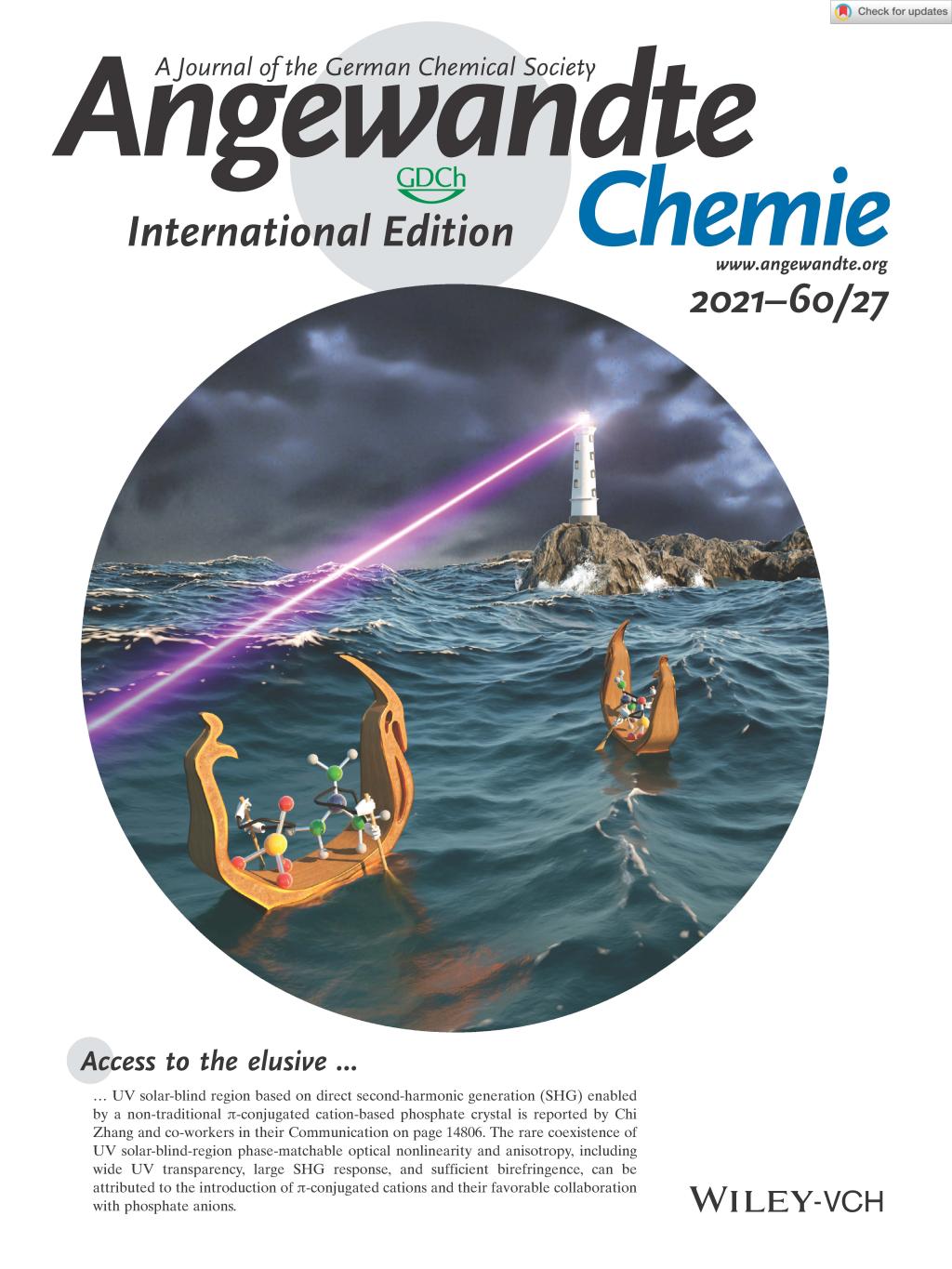 欧洲科学院院士、化学科学与工程学院张弛教授研究团队以传统的磷酸盐为研究对象,发展了一种复合有机π共轭阳离子的合成策略,设计创制了一例在紫外日盲区有潜在应用价值的胍磷酸盐二阶非线性光学晶态材料[C(NH2)3]6(PO4)2·3H2O (GPO)。相关成果“UV Solar-Blind-Region Phase-Matchable Optical Nonlinearity and Anisotropy in a π-Conjugated Cation-Containing Phosphate”(紫外日盲区具有相位匹配非线性光学效应和光学各向异性的π共轭阳离子基磷酸盐),近日以通讯的形式发表于国际化学领域最重要的学术期刊德国《应用化学》(Angewandte Chemie International Edition, 2021, 60(27), 14806-14810)上,并因研究工作的重要创新性和同行专家的高度认同而被Angewandte Chemie编辑委员会遴选为Hot Paper和期刊最新一期的封面文章。