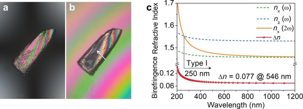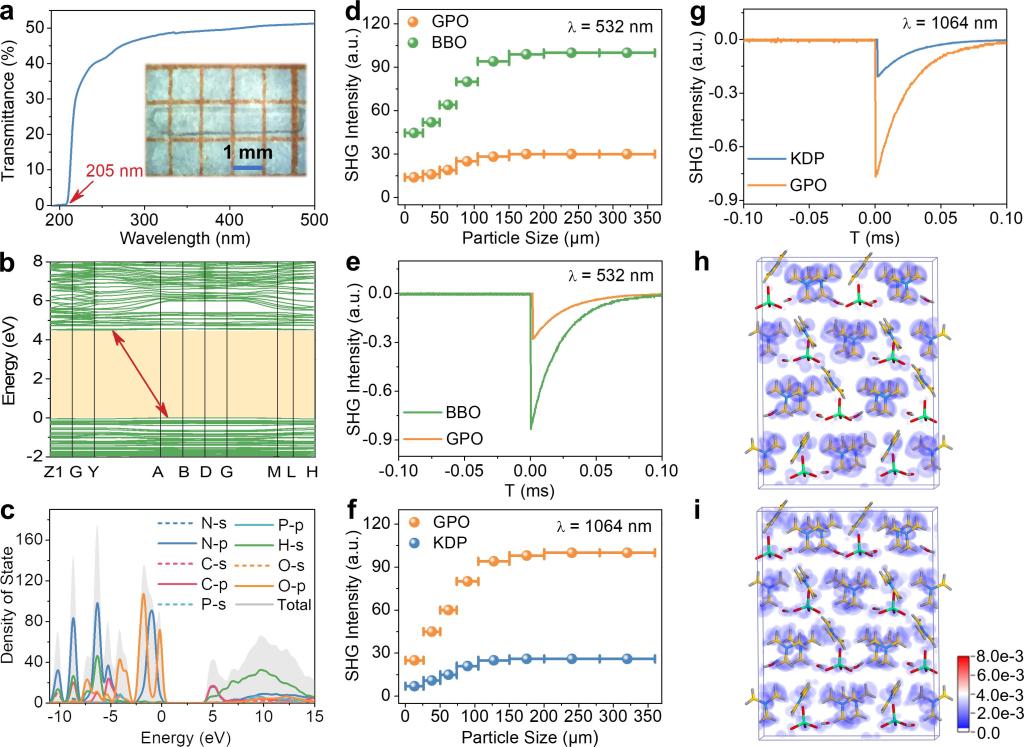 研究团队还通过单晶结构分析并结合第一性原理理论模拟计算,进一步探讨并阐明了GPO可实现倍频效应、双折射率、透光范围三者同步优化增益的内在物理机制,阐释了有利于获得强倍频效应-适中双折射率-宽透光范围的主要原因是有机π共轭阳离子[C(NH2)3]+的引入及其诱导阴离子[PO4]3−基团的有序排列。该胍磷酸盐晶体GPO表现出短的紫外吸收截止边(205 nm),适中的双折射率(0.078 @ 546 nm),GPO的理论计算I型最短相位匹配波长在250 nm处;GPO同时具有强的倍频效应(3.8 × KDP @ 1064 nm;0.3 × β-BaB2O4 @ 532 nm)。该研究为探索紫外日盲波段下二阶非线性光学晶体材料提供了一种全新的思路。