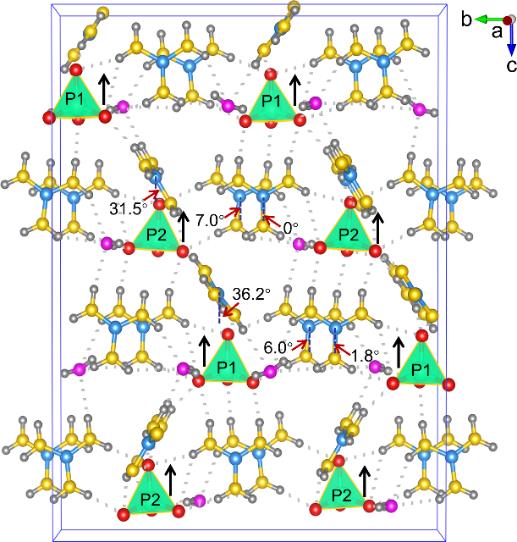 在这一研究中,研究团队提出了一种通过复合有机π共轭阳离子胍[C(NH2)3]+来协同增强磷酸盐材料倍频效应和双折射的方法。有别于常见的金属阳离子,平面三角形构型有机阳离子[C(NH2)3]+具有π共轭分子轨道,可提高磷酸盐材料的光学倍频效应和光学各向异性;不同于二阶姜泰勒金属阳离子,将具有强共价键的阳离子[C(NH2)3]+引入到磷酸盐体系中,有利于实现较宽的紫外透过范围;优化排列的阳离子[C(NH2)3]+通过氢键作用调控磷酸基团,当两者极化方向一致时可表现出叠加的微观二阶极化率和光学各向异性,这有利于同时优化倍频效应和双折射。基于这一复合有机π共轭阳离子的策略,成功设计创制了一种性能优异的紫外日盲区二阶非线性光学晶体GPO。