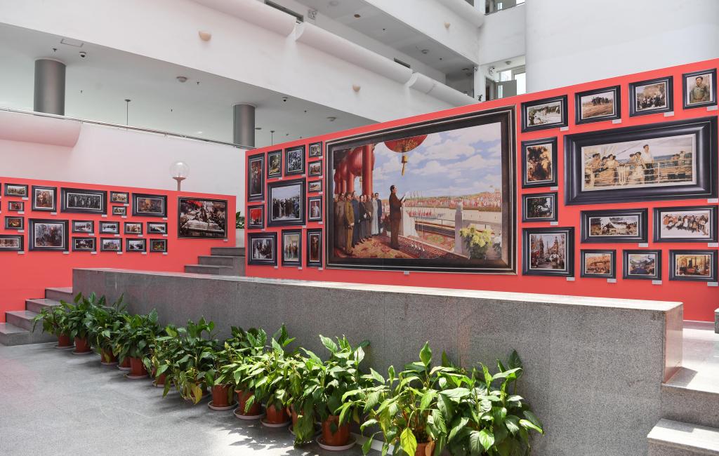 来自两校的10余位师生在两个月时间中,从国家发行的大量画册和书籍中挑选了具有代表性的118幅绘画作品,其中包括同济大学教师历年来近10幅作品。展览分为二个板块,第一板块从1921年中国共产党成立至1949年新中国诞生这个时间段,第二板块展示的是自新中国成立以来中国翻天覆地的崭新面貌。第一板块以油画《启航》为先导,集中体现了有历史代表性的事件,包括毛泽东同志考察湖南农民运动、南昌起义、秋收起义、井冈山会师、红军长征、抗日战争和解放战争等,最后以《开国大典》结尾。在第二板块中,画于1959年的《毛主席万岁》宣传画表达了新中国成立10周年时中国人民的喜悦心情;《科学的春天》表现的是全国科学大会,吹响了向科学进军的号角;《出征》呈现的是中国人首次进军太空的情景。