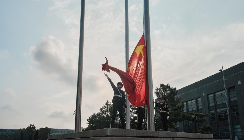 在庄严激昂的乐声中,国旗护卫队身着戎装,迈着整齐的步伐,护送着五星红旗走向升旗台。全场师生怀着激动喜悦的心情,一同高唱国歌,注目凝望。在雄壮的国歌声中,五星红旗冉冉升起,迎风飘扬。
