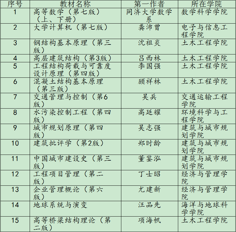 为深入贯彻落实习近平总书记关于教材建设的重要指示精神,推动上海市高等教育教材质量水平的提升,今年年初,上海市教委面向全市高校组织开展了首届全国教材建设奖遴选推荐工作,共有125本教材(高等教育类)获推荐参评全国教材建设奖。近日,上海市教委将这125本教材认定为首批上海高等教育精品教材,我校共有《高等数学(第七版)》等15本教材获上海高等教育精品教材称号。