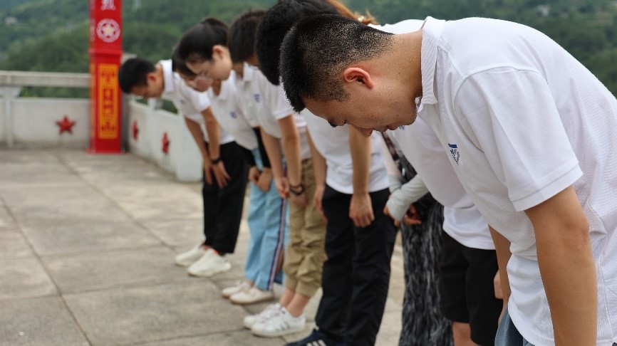 丙安古镇入口的赤水河吊桥就是当年红军一渡赤水所在的渡口,吊桥上红星闪闪,“长征”二字分外抢眼,踩着吊桥的一块块木板,队员们身临其境,仿佛穿越回那个战火纷飞的年代。青杠坡红军战斗遗址四面环山,巍巍青杠坡见证了红军战士铁骨铸忠魂,队员们拾阶而上,心情愈发沉重。石碑后面的烈士陵园里,一座座墓碑无声地向队员们讲述着往昔峥嵘岁月,浮雕塑像上的身影愈发高大伟岸,队员们接受了思想洗礼。在四渡赤水纪念馆,通过地图演示、物品陈列、图片展示和文字讲解,队员们更加深入了解了四次飞渡赤水河的光辉历史。团队成员刘乐体会十分深切:“是战士们的坚定意志、听从指挥,确保了胜利的取得,我们要在今后的工作和学习中加倍努力才行。”教师王同宇感慨道:“通过沉浸体验式的教育学习,队员们更加坚定了永远跟党走的信心与决心,四渡赤水留给我们的不仅是一场经典战役,更多的是红军当年的顽强战斗精神,先辈们崇高的革命精神将滋养无数中国青年。”